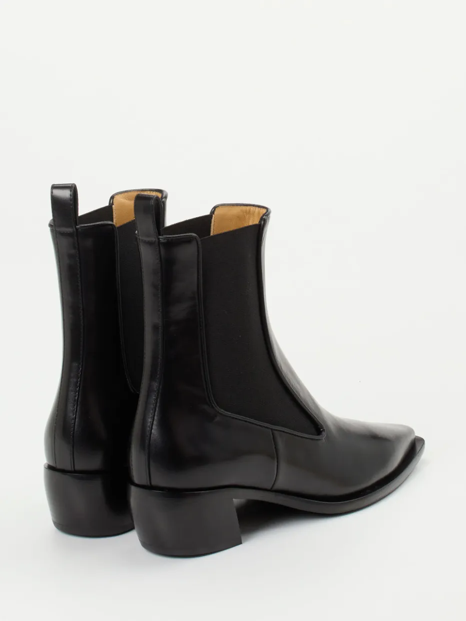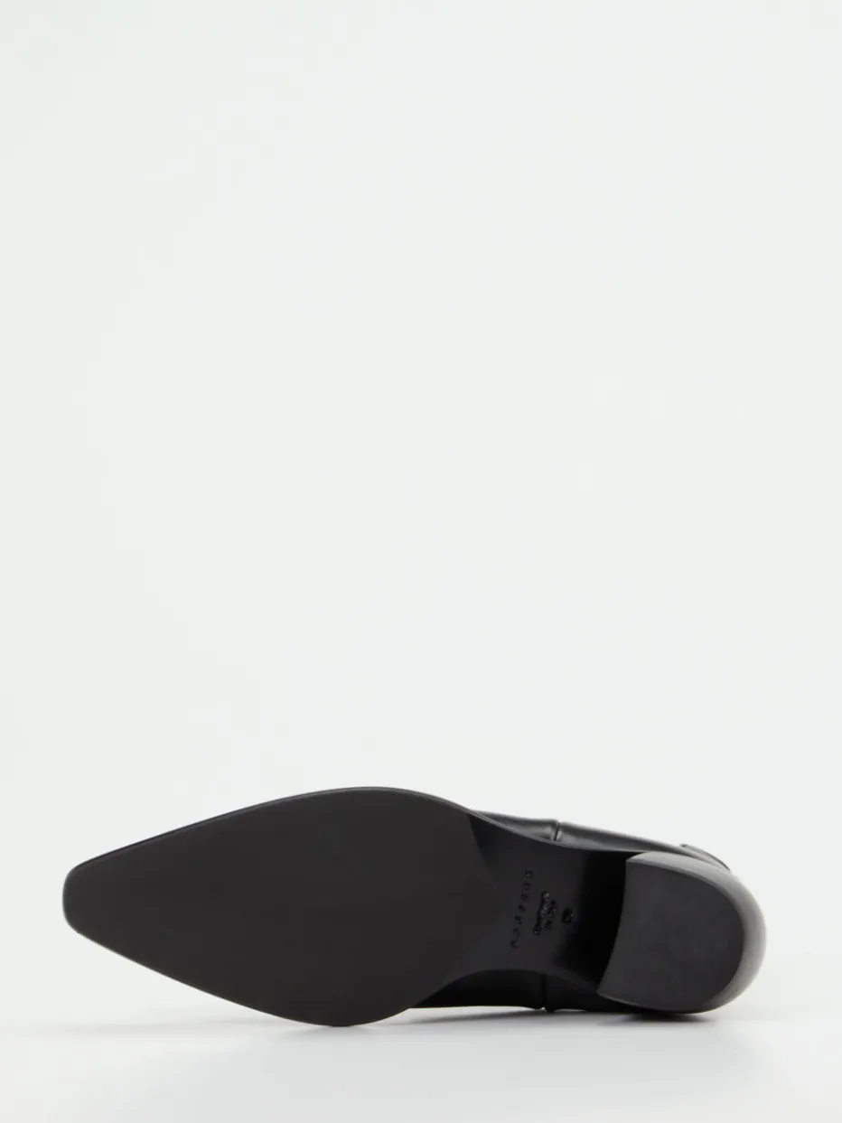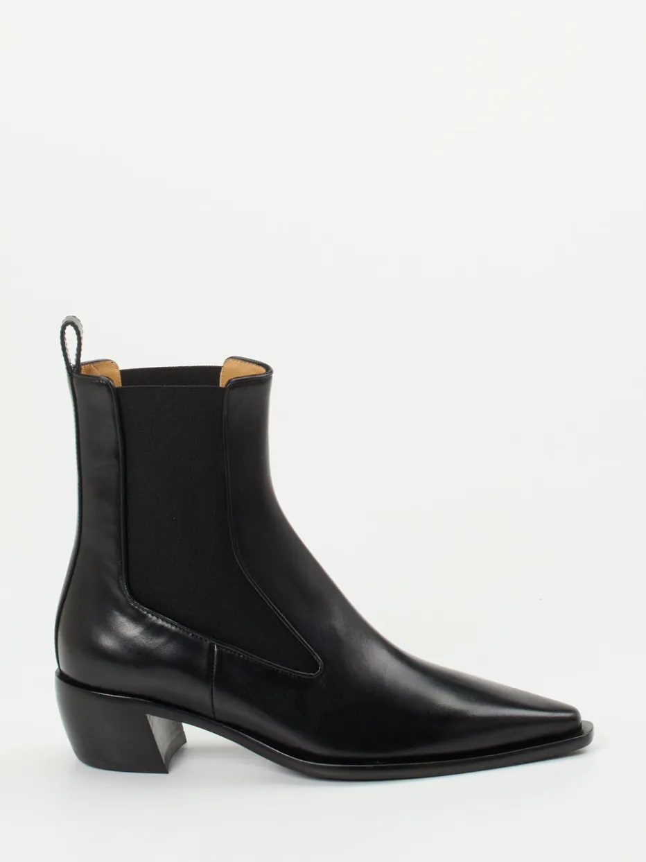 Schwarzes Kalbleder, spitz zulaufende Form und präzise Linienführung vereinen sich bei diesem Modell zu moderner Eleganz mit Western-Anklang.