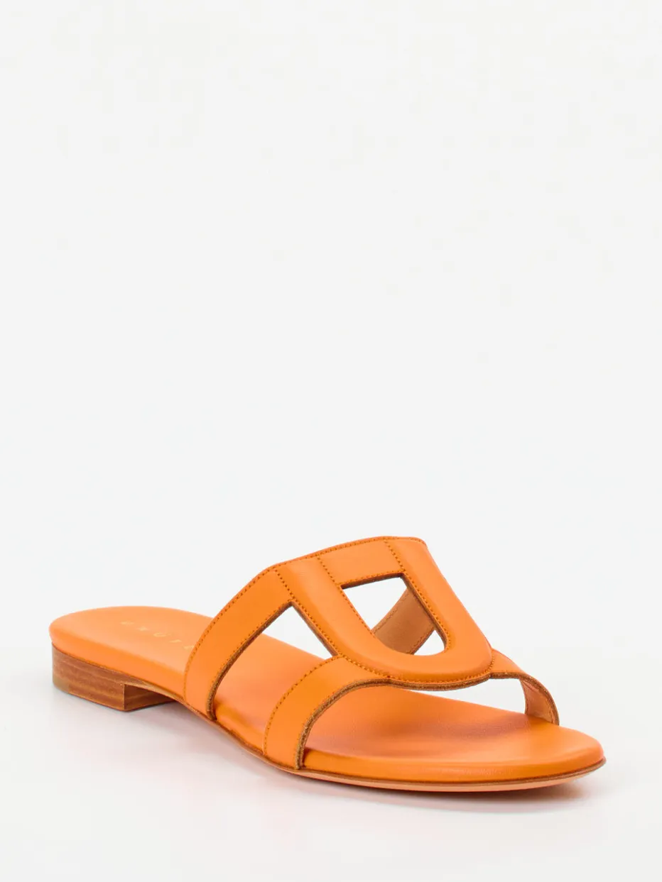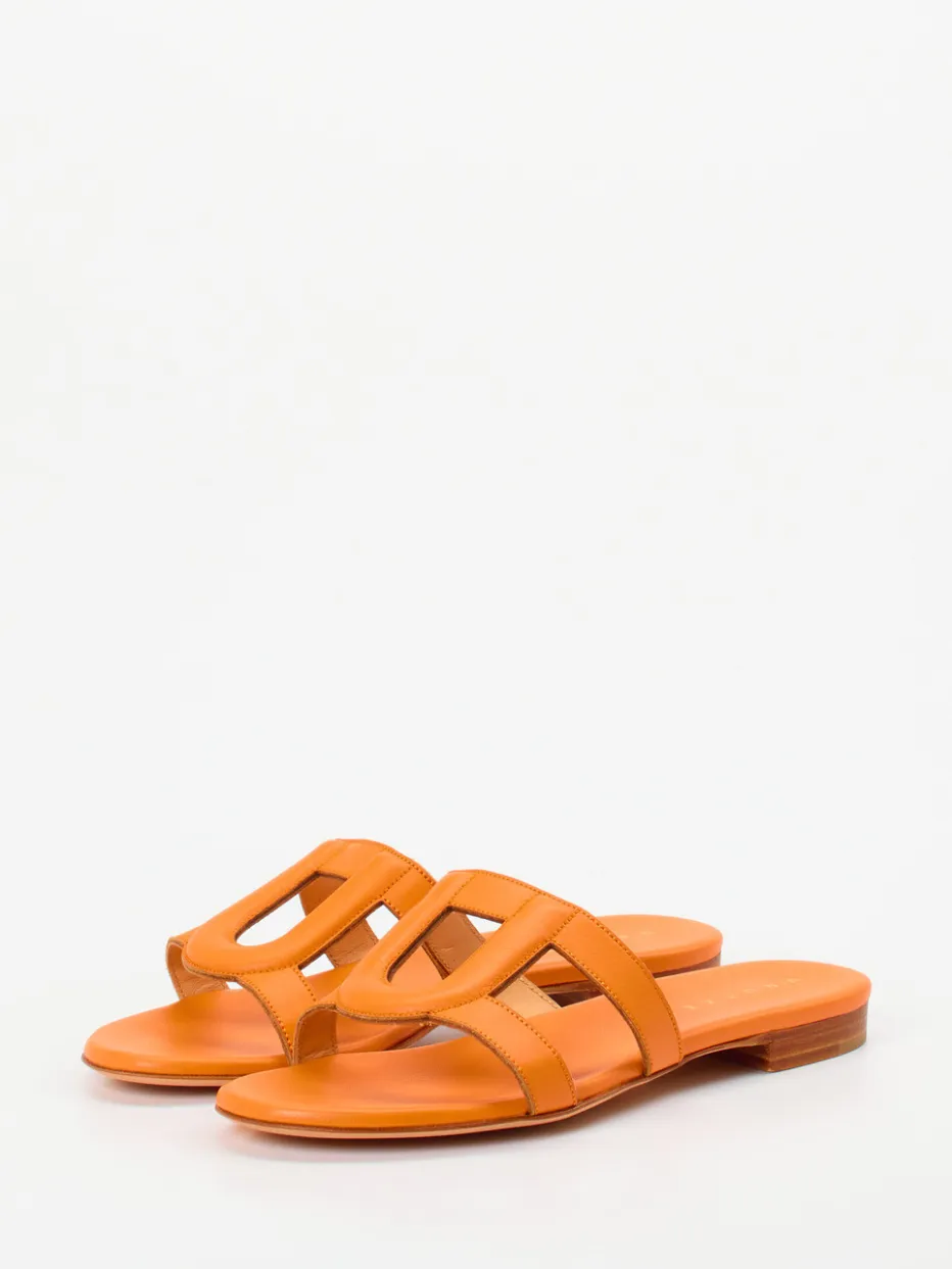 Design trifft sommerliche Nonchalance.Unützer präsentiert eine moderne Damen-Slide, ideal für entspannte Sommertage. Die aus hochwertigem Kalbleder gefertigte Pantolette zeigt sich in einem intensiven Orangeton mit matter Oberfläche und Ton-in-Ton-Nähten. Die gepolsterten Riemen bilden eine klare, symmetrische Silhouette mit offener Zehenpartie, ganz ohne Verschluss. Eine flache Sohle aus Leder mit einem dezenten Absatz in Holzoptik unterstreicht das dezente Design. Inspiriert vom mediterranen Chic und dem Trend „Quiet Luxury“, ist dieses Modell gleichzeitig komfortabel und stilistisch wegweisend. Besonders stimmig zu Naturfasern wie Leinen kombinierbar. Zeitloser Komfort mit italienischem Designanspruch.