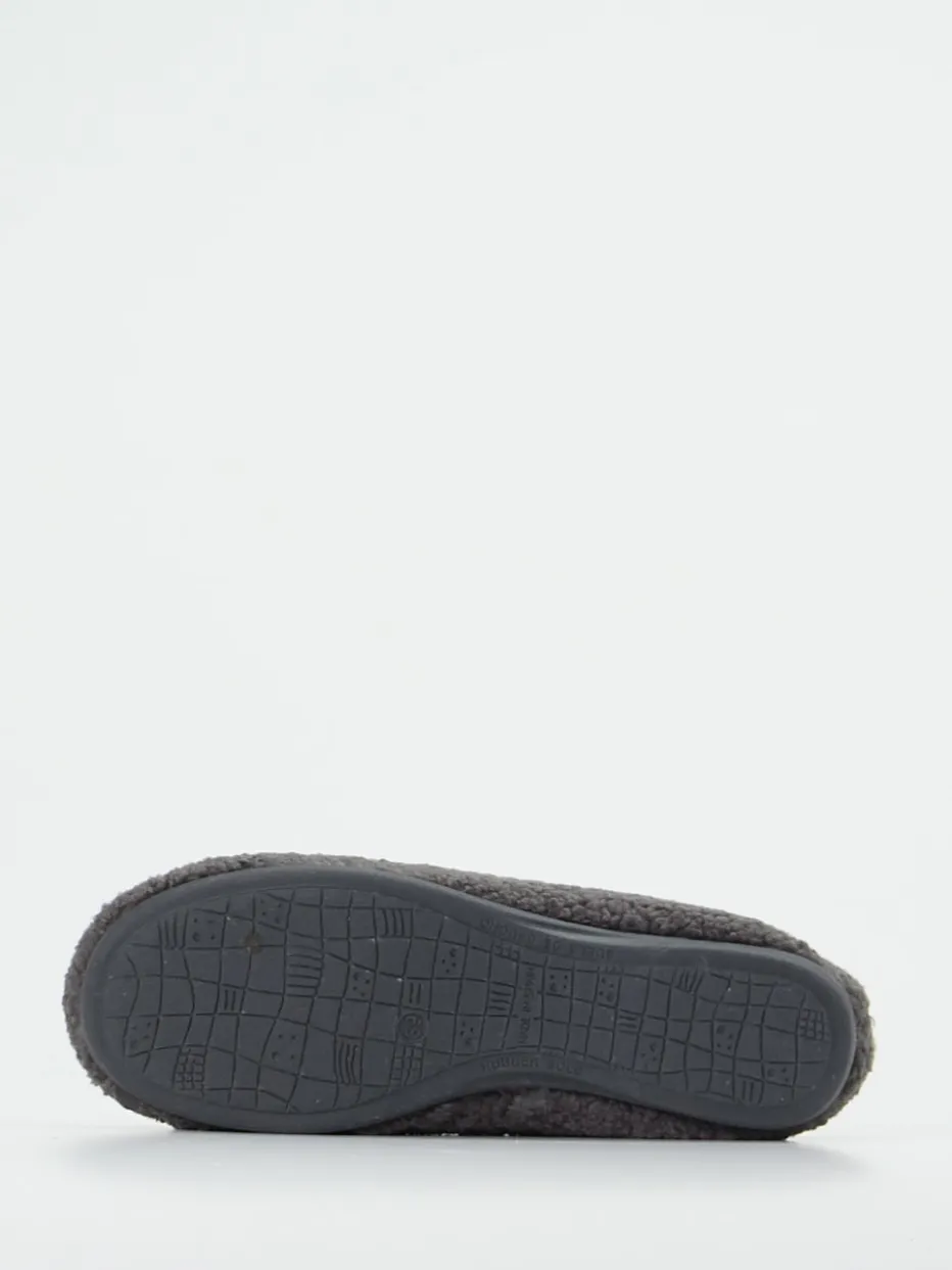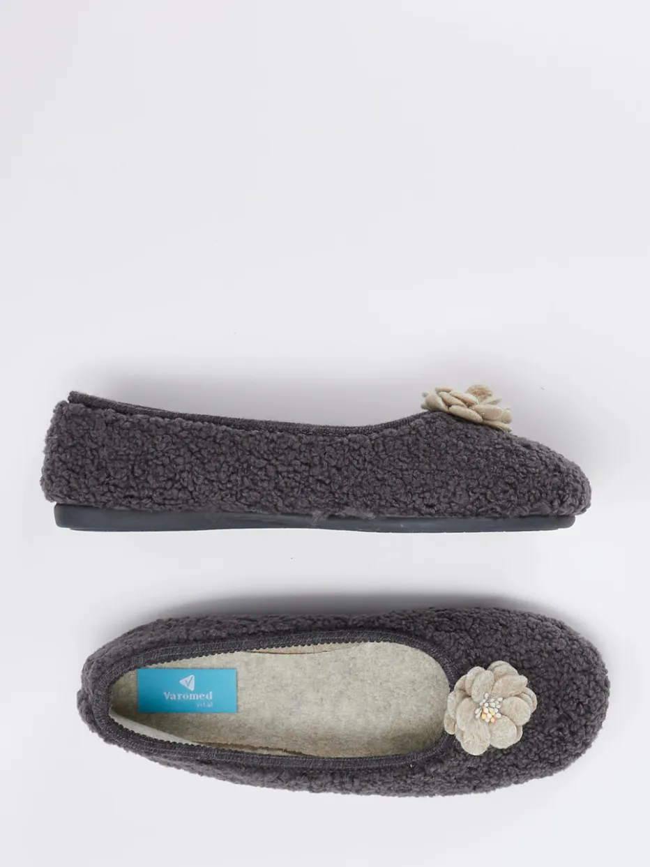Gemütlich wohnen mit Stil.Die Marke Varomed präsentiert einen Damen-Ballerina-Hausschuh mit wohnlichem Charakter. Ideal für entspannte Stunden auf dem heimischen Sofa: Das weiche Textil-Obermaterial in Filzoptik schmiegt sich sanft an und zeigt sich in elegantem Anthrazitgrau. Die klassisch runde Form, kombiniert mit einem elastischen Einstieg, bietet hohen Komfort und erleichtert das Anziehen. Eine dekorative Filzblume mit dezentem Perlendetail unterstreicht die feminine Gestaltung. Die rutschhemmende Gummisohle sorgt für Sicherheit auf glatten Böden und rundet die Funktionalität ab. Das Modell passt gut zu Fleece-Hausanzügen oder kuscheligen Strickteilen. Komfortabel, durchdacht und mit Sinn für wohnliche Ästhetik designed.