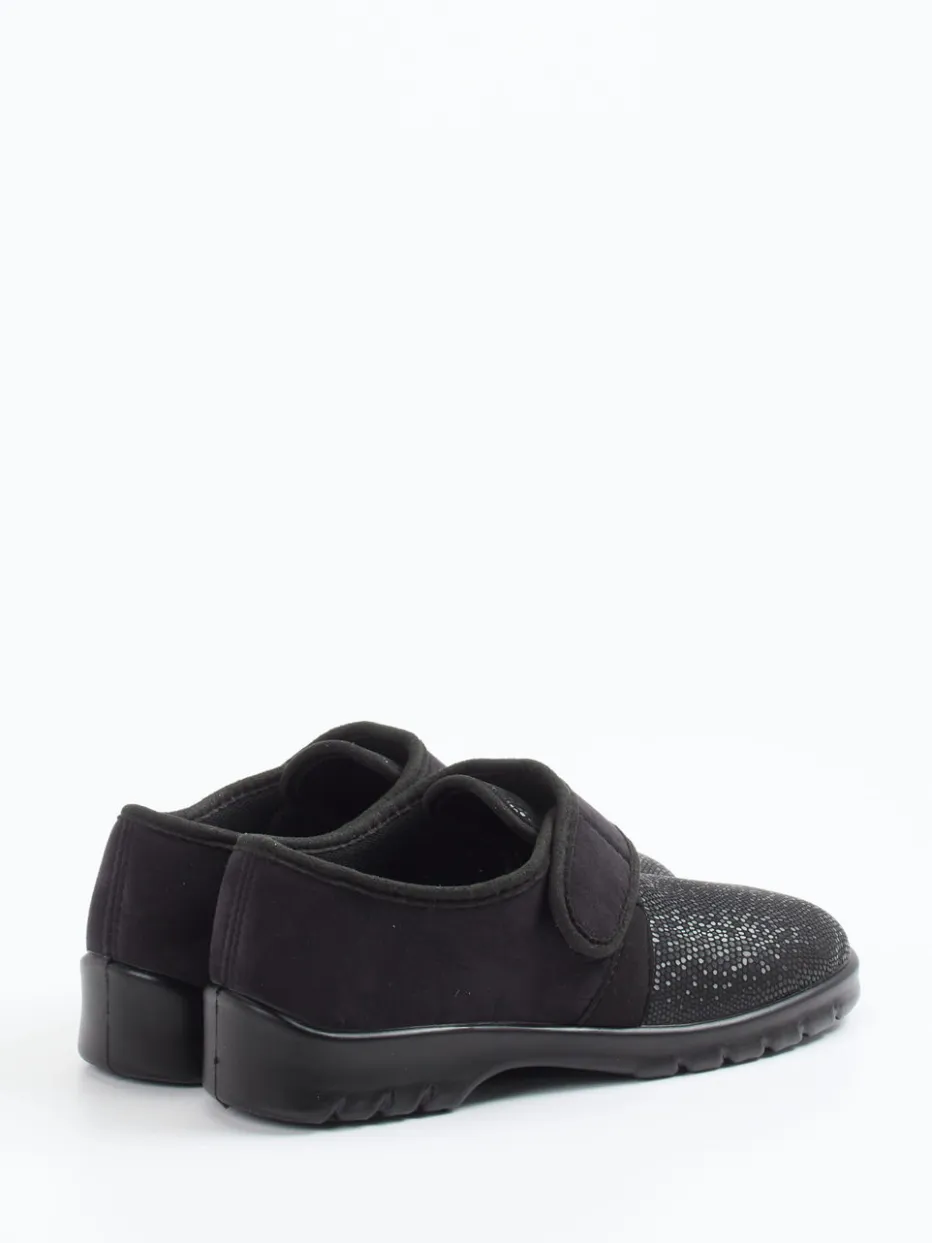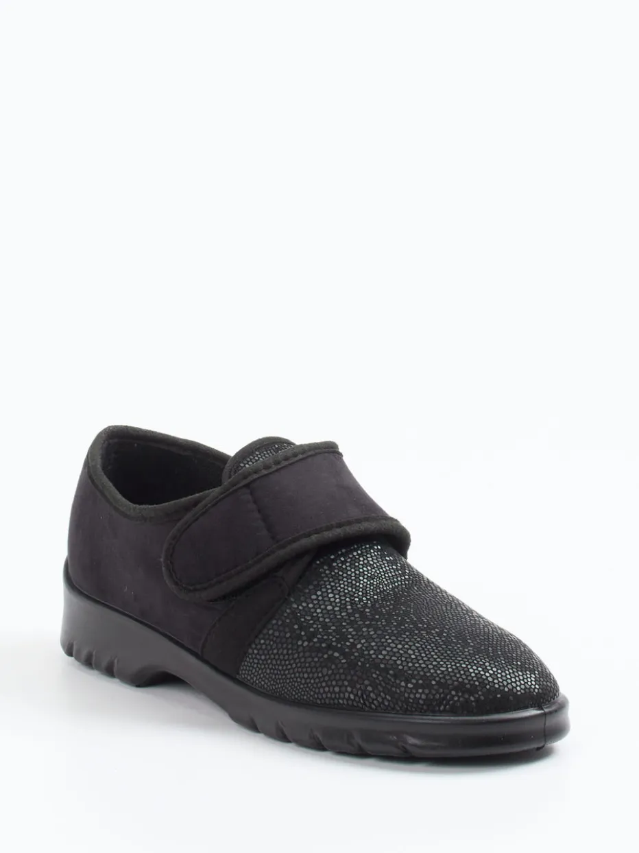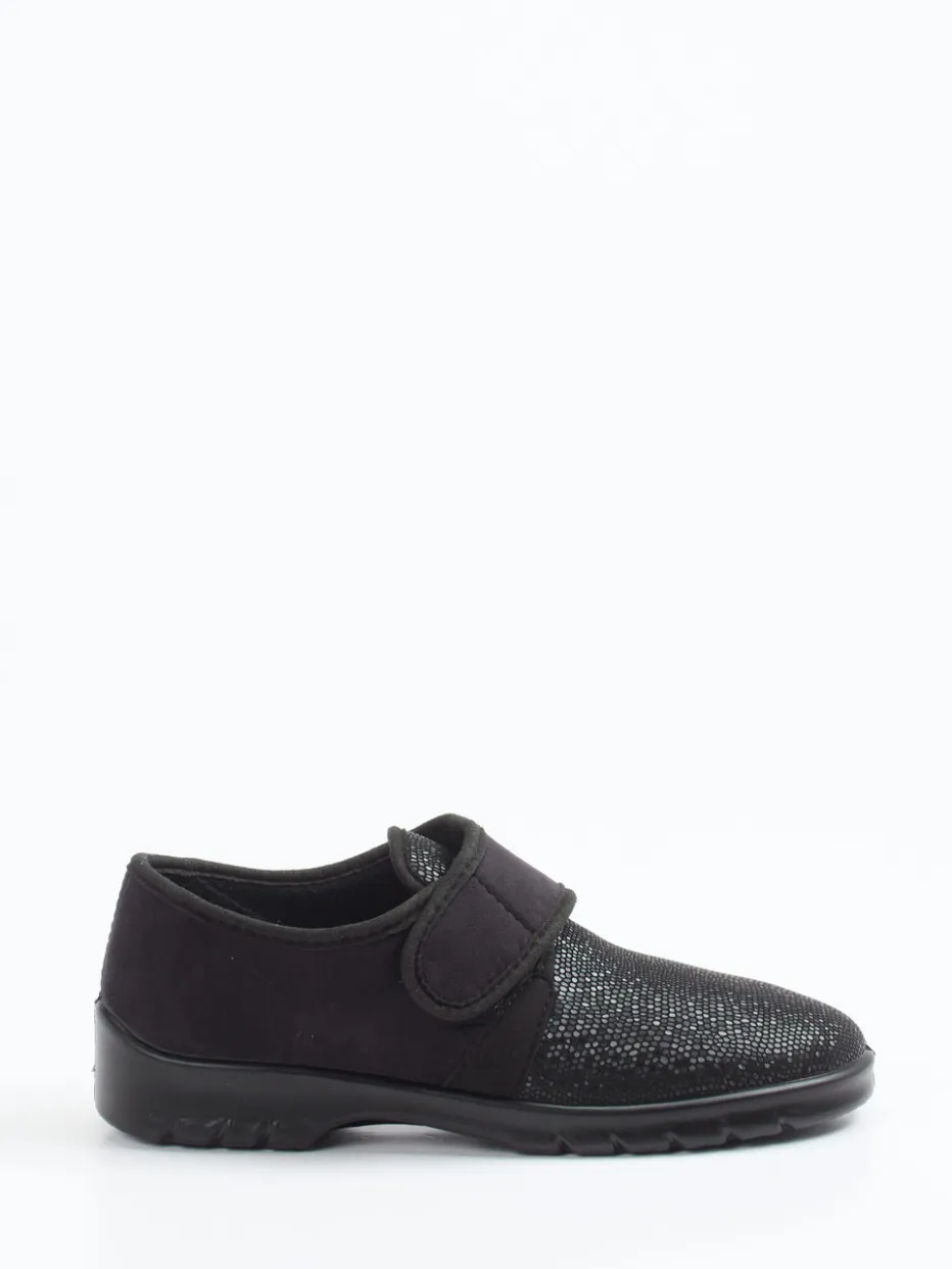 Ein komfortorientierter Damen-Hausschuh mit ergonomisch weichem Einstieg, strapazierfähiger Gummisohle und pflegeleichter Oberfläche – ideal für entspannte Alltagsmomente.