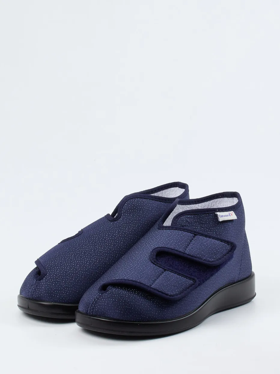 Ruhiger Komfort für sensible Füße.Varomed präsentiert mit diesem halbhohen Hausschuh einen funktional konzentrierten Therapieschuh. Ideal für entspannte Stunden zu Hause oder im täglichen Einsatz bei gesundheitsorientiertem Bedarf: Das elastische Textilmaterial ist samtig matt, zeigt sich in Dunkelblau mit mikropunktierter Struktur und liegt weich am Fuß. Zwei breite Klettverschlüsse ermöglichen einen mühelosen Einstieg – auch bei geschwollenen Füßen. Die ergonomische PU-Sohle bietet Halt, während Frottee-Innenfutter und Wechselfußbett für angenehme Dämpfung sorgen. Optisch reduziert, trifft der Look den Trend „Quiet Comfort“. Ein pflegeleichter Komfortschuh mit funktionalem Anspruch und Varomed-typischer Alltagstauglichkeit.