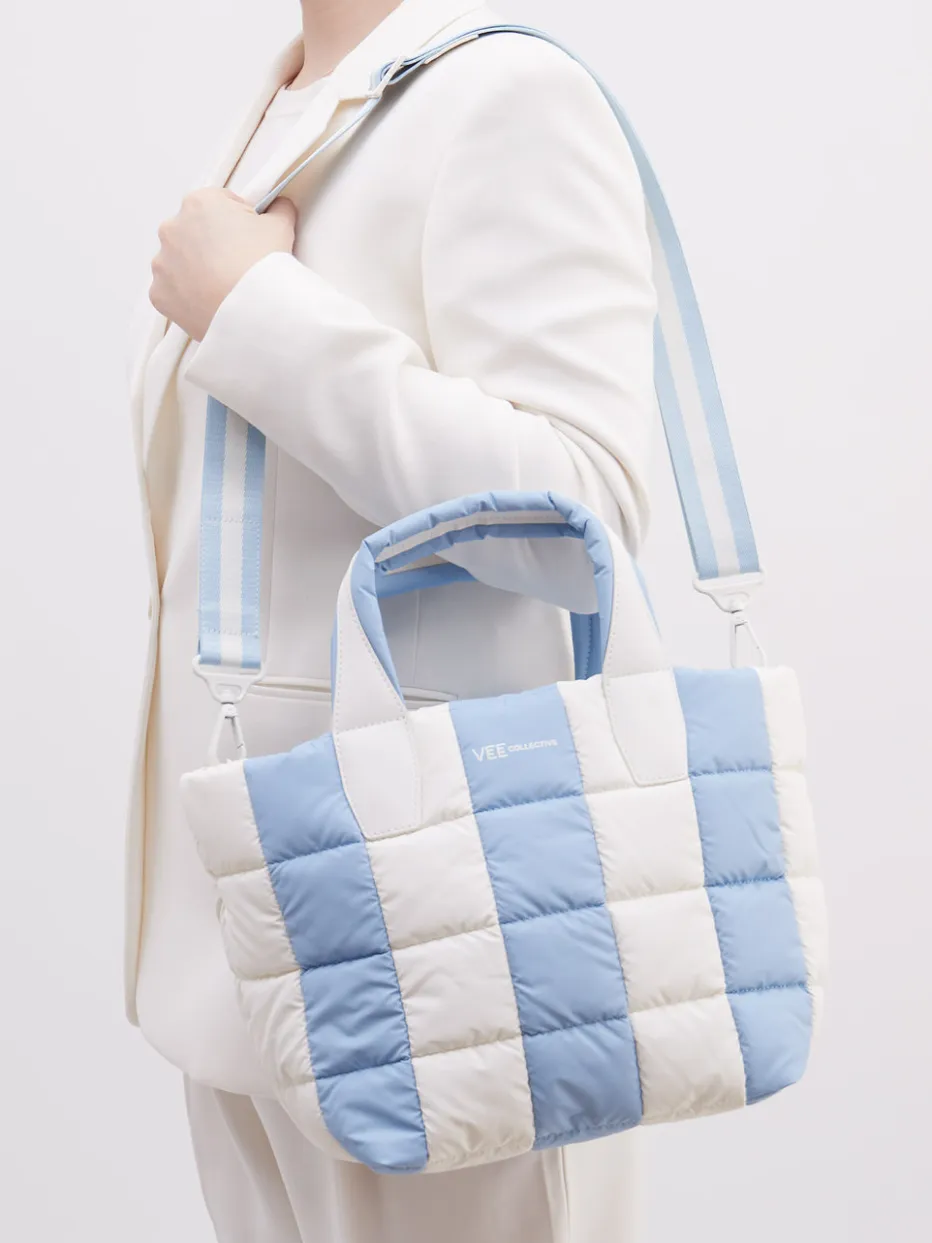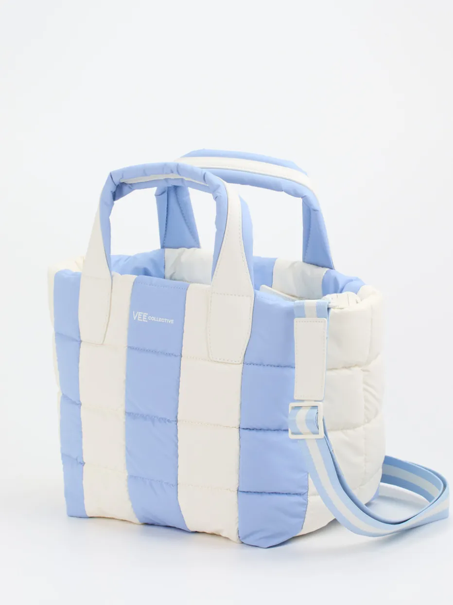 Diese modische Umhängetasche des Berliner Labels Vee Collective überzeugt mit ihren vielen wünschenswerten Eigenschaften: Das zu 100% recycelte Nylon ist strapazierfähig, angenehm leicht, schmutz- und wasserabweisend. Das blauweiße Streifenmuster wirkt zusammen mit den weißen, veganen Kunstlederelementen zugleich frisch und zeitlos. Im Innenraum können Sie Ihre Utensilien dank verschiedener Fächer geordnet und strukturiert verstauen. Mit dieser nachhaltigen Tasche erwerben Sie ein langlebiges Produkt von hoher Qualität. – Obermaterial: Ripstop Nylon – Futter: Textil – Farbe: Blau/ Weiß – Größe: ca. 25 x 40 x 20 cm (H x B x T) – Schulterriemen: max. ca. 125 cm, verstell- und abnehmbar – Verschluss: Reißverschluss – Innen: ein Reißverschlussfach, zwei Netzfächer, ein Druckknopffach – Außen: zwei zusätzliche Reißverschlussfächer – Extras: herausnehmbare Innentasche (ca. 20 x 20 cm)