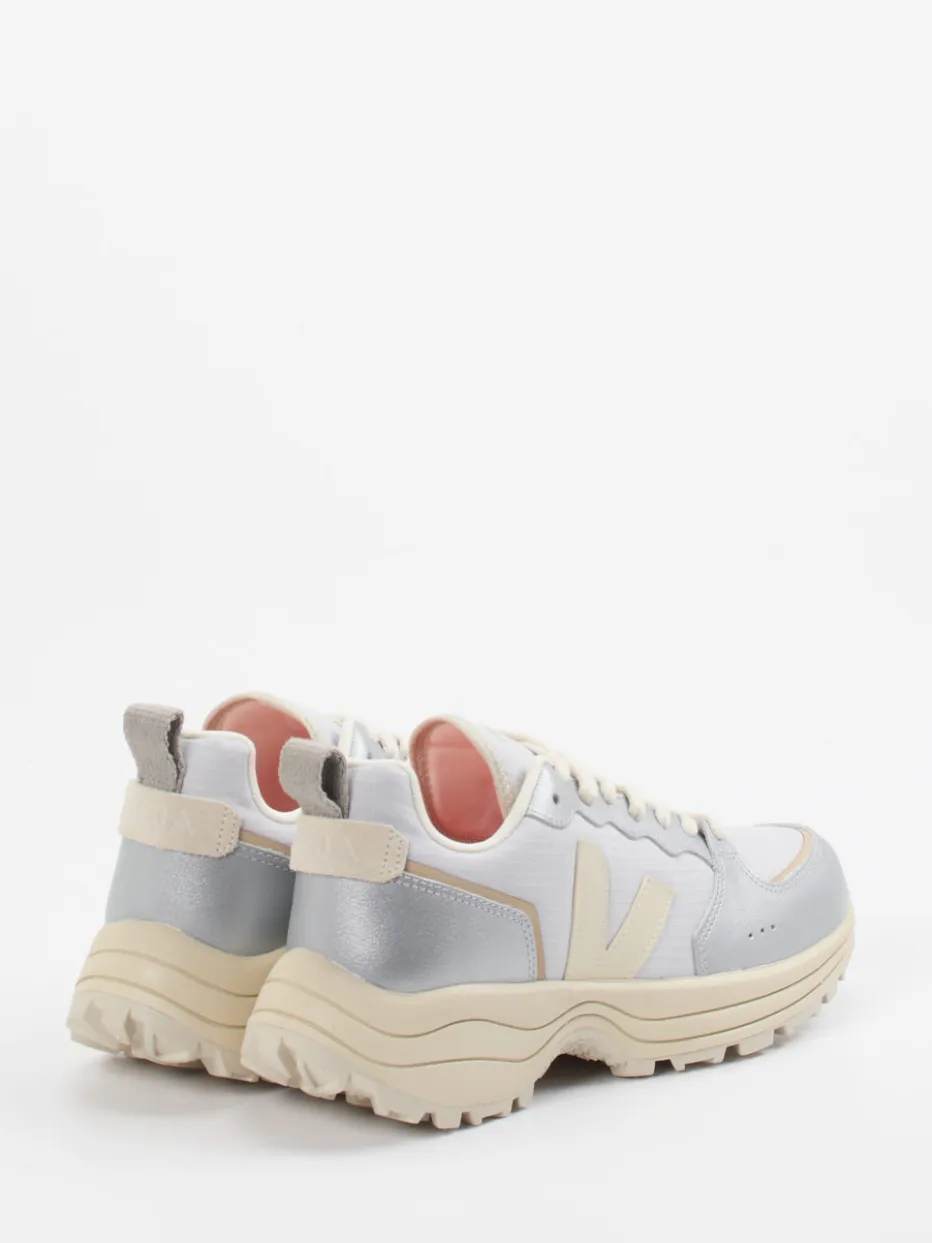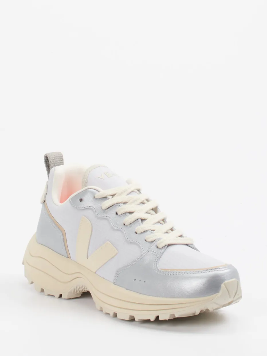 Streetstyle trifft auf Umweltgedanken.VEJA präsentiert einen modischen Chunky Sneaker aus strapazierfähigem Ripstop-Textil und silberfarbenem Glattleder. Ideal für urbane Abenteuer, vereint das Modell eine voluminöse Form mit strukturiertem Mesh und markanter Profilsohle. Die cremeweiße Grundfarbe wird durch metallicfarbene Overlays betont. Der Materialmix aus recyceltem Polyester, Glattleder-Optik aus Synthetik sowie der Einsatz biologischer Rohstoffe wie Zuckerrohr und Naturkautschuk machen den Schuh zu einem Vorbild in Sachen Nachhaltigkeit. Streetwear-Einflüsse und minimalistische Formen setzen modische Akzente. Lässt sich ideal mit Oversized-Looks und sportlichen Accessoires kombinieren. Nachhaltige Ästhetik in markentypischer Qualität von VEJA.