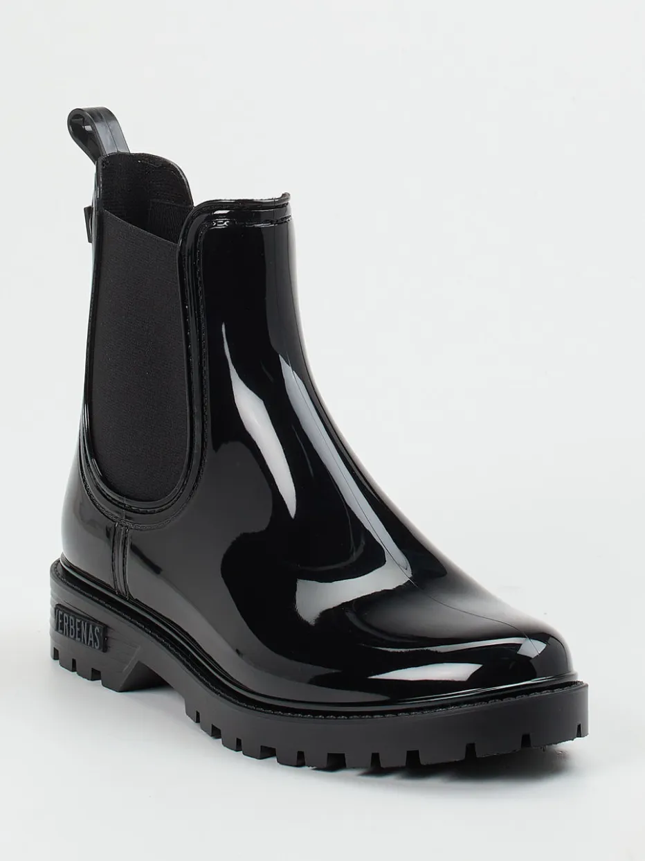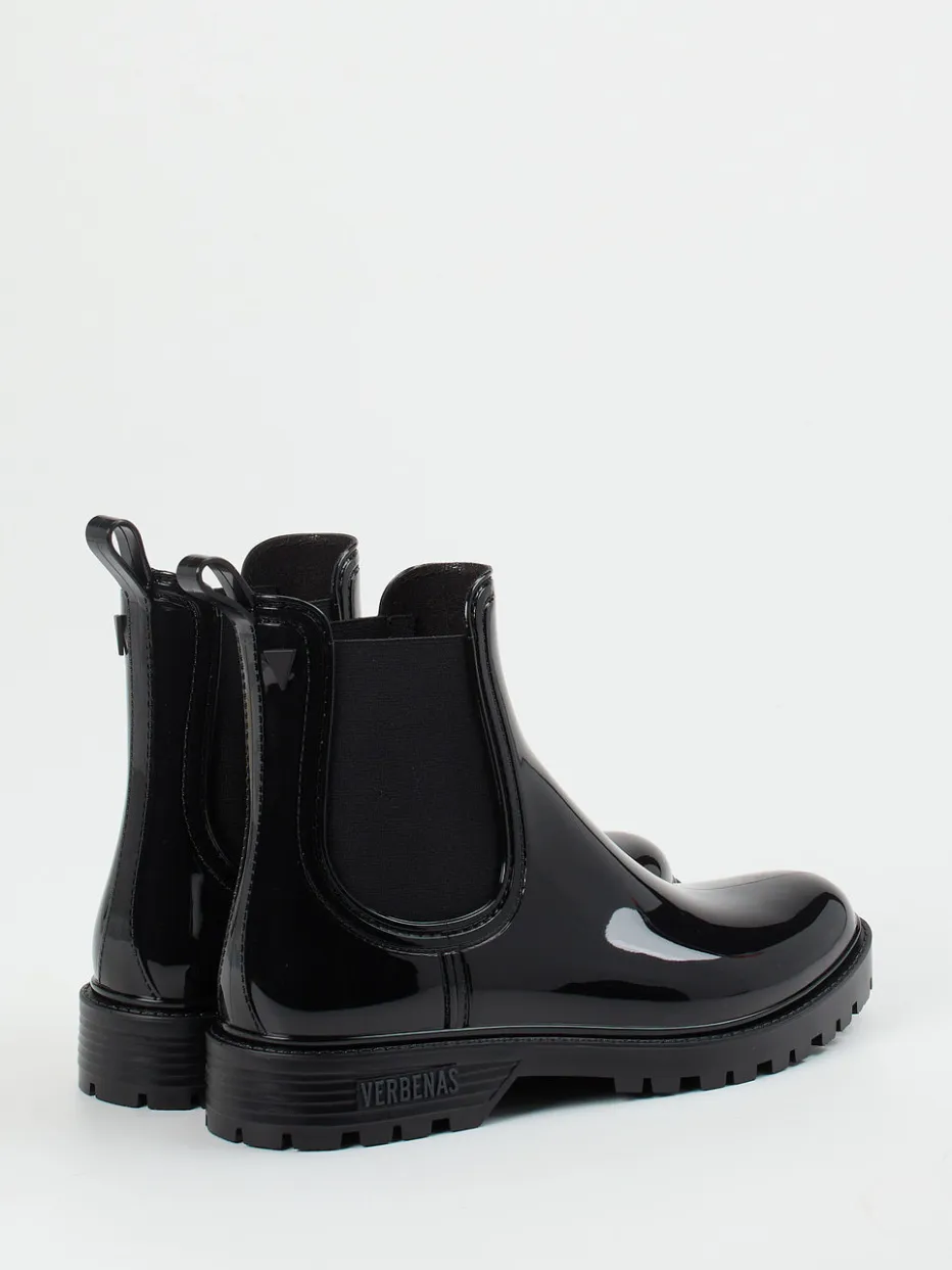 Schwarzer Glanz für graue Tage.Verbenas interpretiert den Chelsea Boot als wetterfesten Begleiter für den Alltag. Ideal für urbane Regenspaziergänge oder spontane Outdoor-Touren: Diese schwarzen Chelsea Boots bestehen aus wasserresistentem Synthetik mit glänzender Oberfläche und sind mit elastischen Ton-in-Ton-Einsätzen sowie einer robusten Profilsohle ausgestattet. Die schlanke, knöchelhohe Form sowie die dezente Markenprägung sorgen für einen klaren, minimalistischen Look. Das textile Innenfutter und die Zuglasche am Schaft bieten praktischen Komfort. Trendig im „Rainwear Revival“ positioniert, fügen sich diese Boots nahtlos in moderne Streetwear-Looks ein. Verbenas vereint wetterfeste Funktionalität mit urbanem Stilverständnis.