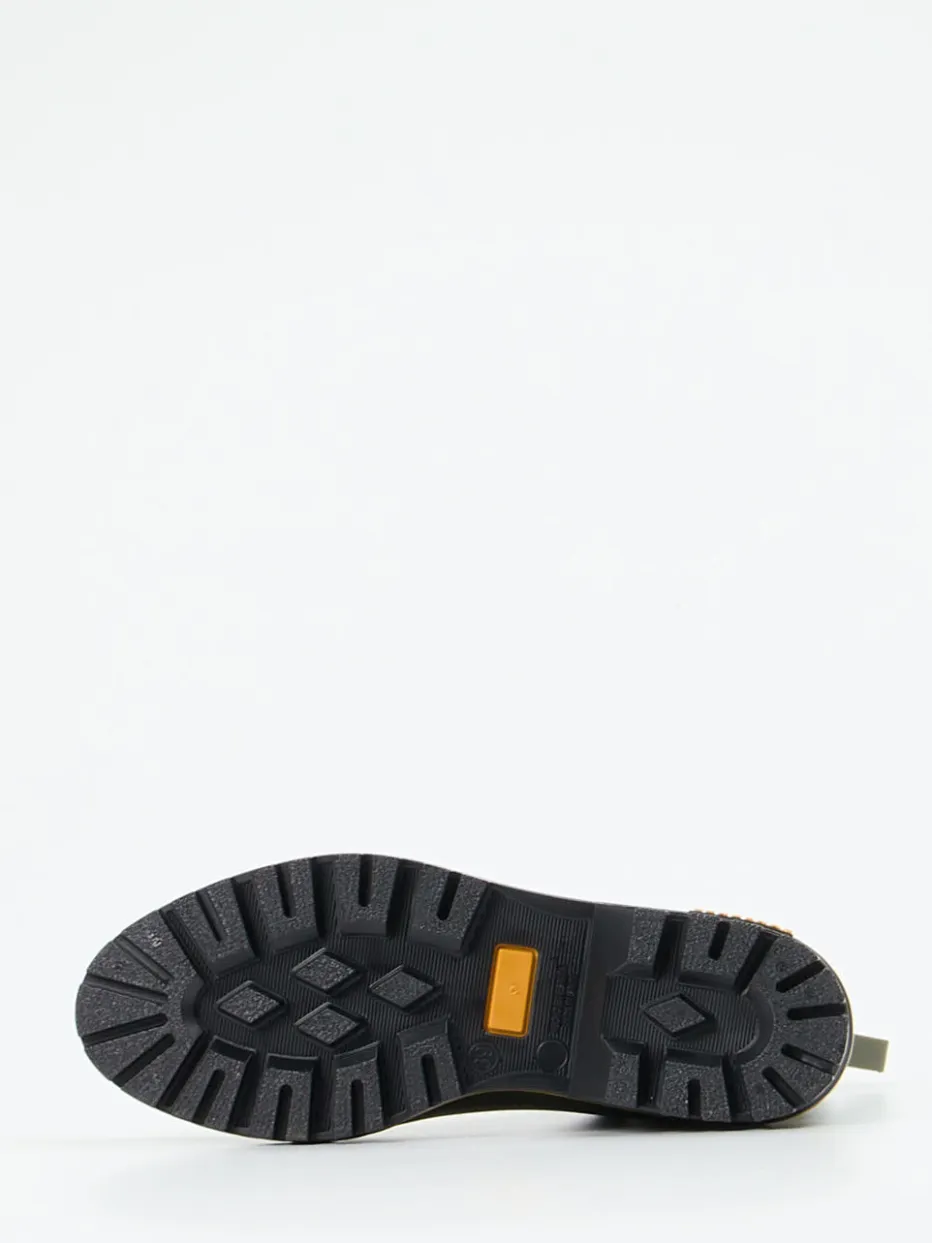 Robust im Alltag, stilvoll im Detail.Die Marke Verbenas zeigt mit diesen Chelsea Boots aus der Kategorie Gummistiefel ein funktionales Statement für nasse Tage. Ob auf herbstlich nassen Straßen oder beim Spaziergang durchs nasse Gelände: Das olivgrüne Synthetikmaterial mit matter Oberfläche schützt zuverlässig vor Feuchtigkeit. Seitliche Elastikeinsätze in Schwarz und eine auffällige Kontrastnaht in Orange verleihen den knöchelhohen Stiefeletten eine moderne Note. Die griffige Kreppsohle mit gelbem Logo-Detail garantiert Stabilität auf nassem Untergrund. Inspiriert von Gorpcore und Minimalismus, lassen sich die Boots vielseitig kombinieren – etwa zur lässigen Outdoor-Jacke. Regenfeste Leichtigkeit trifft bei Verbenas auf urban durchdachte Funktionalität.