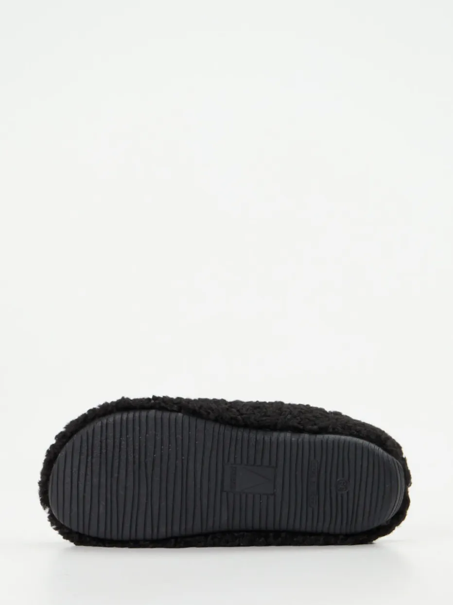 Für entspannte Stunden zu Hause.Die Marke Verbenas präsentiert mit diesen schwarzen Hausschuhen einen wohnlichen Allrounder für die kalte Jahreszeit. Ob beim Lesen auf der Couch oder an langen Wochenenden – das seidig-weiche Teddyfleece-Material sorgt für ein angenehmes Tragegefühl. Das Modell vereint eine geschlossene Vorderpartie mit offener Ferse und bietet durch das mit Textil ausgekleidete Fußbett zusätzlichen Komfort. Ein seitlicher Label-Patch setzt optische Akzente, während die strukturierte Gummisohle für Halt auf glatten Böden sorgt. Das puristische Design orientiert sich am Coziness-Core-Trend und passt perfekt zu Casual-Loungewear. Komfortstarkes Unisex-Design mit markentypischer Wohlfühlästhetik.