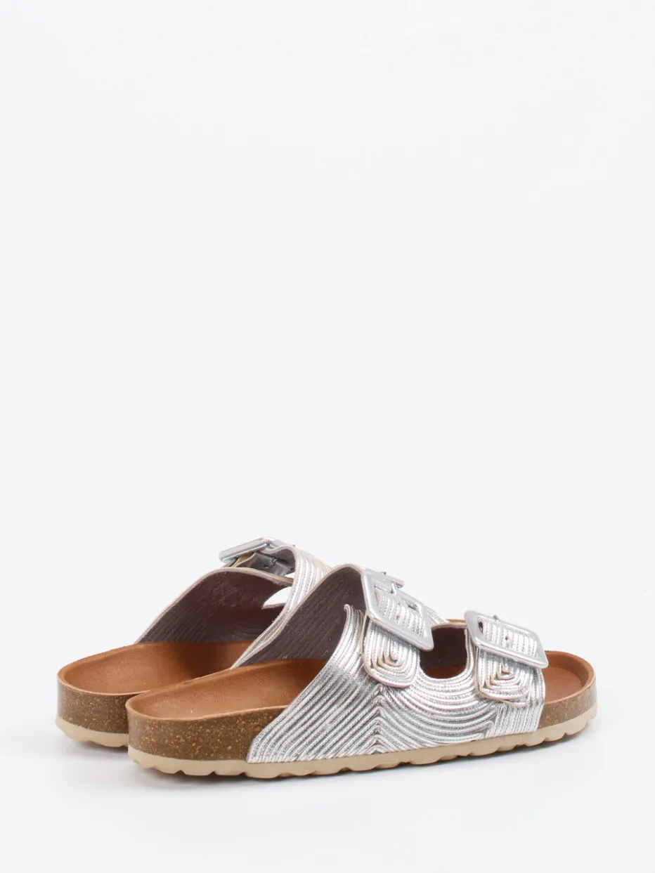 Glanzstück für entspannte Sommermomente.Verbenas interpretiert die klassische Damen-Pantolette neu. Ideal für warme Tage in der Stadt oder entspannte Stunden am Strand: Die Zwei-Riemen-Pantolette von Verbenas kombiniert silberfarbenes Metallicleder mit glänzender, strukturierter Oberfläche im Wellenmuster. Das offen gehaltene Design mit verstellbaren Schnallen und ergonomischem Kork-Fußbett verspricht lässigen Komfort mit Stil. Die flache Gummisohle mit rutschhemmendem Profil sorgt für sicheren Halt. Perfekt für trendorientierte Looks im Metallic-Look – ob zu Leinen-Shorts oder Maxi-Kleid. Komfort trifft auf sommerliche Eleganz mit modischem Akzent.