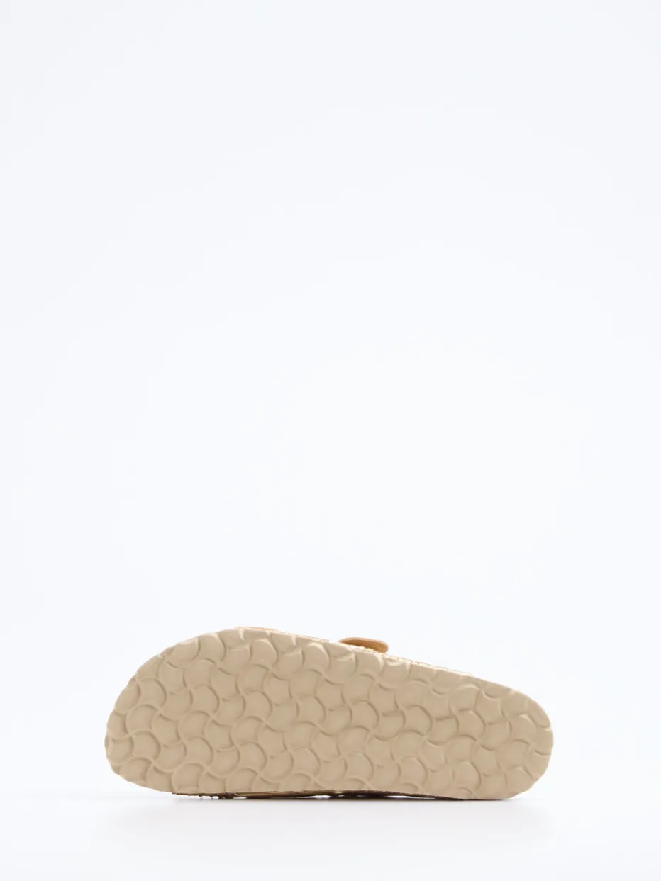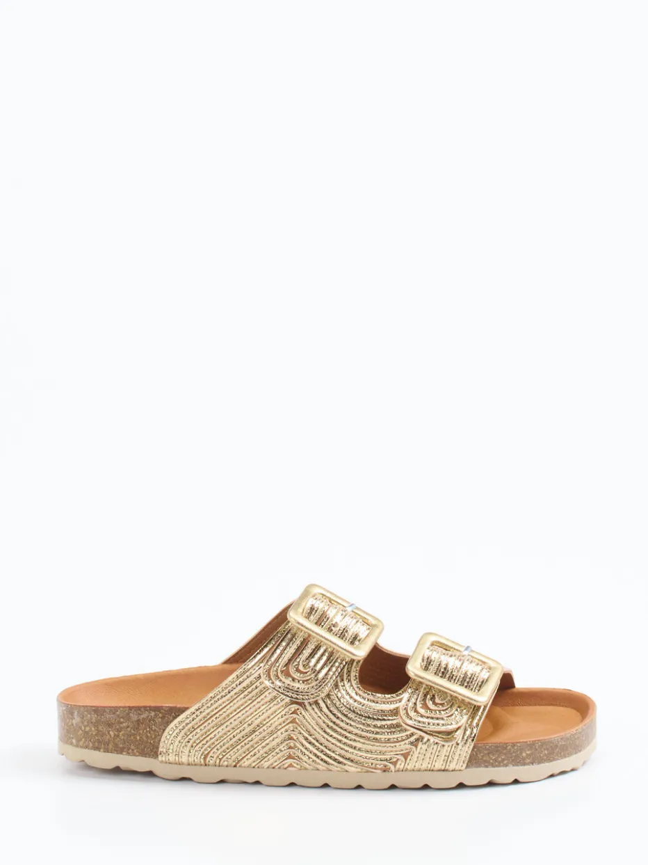 Minimalismus mit Glanzwirkung.Verbenas interpretiert die klassische Zweiriemer-Pantolette mit einem goldfarbenen Metallic-Finish neu. Ob Stadtbummel oder Strandpromenade – der schimmernde Look passt sich stilvoll an verschiedene Alltagsszenarien an. Die offene, flache Silhouette besteht aus synthetischem Metallicmaterial mit strukturierter Oberfläche, ergänzt durch ein ergonomisches Fußbett aus nachhaltigem Kork. Goldfarbene Schnallen setzen modische Akzente, während die rutschhemmende Gummisohle sicheren Halt bietet. Das Design orientiert sich am Retro-Stil der 70er und greift den Metallic-Trend der Saison auf. Kombiniert mit Leinen-Shorts und Strohtasche entsteht ein entspannter Sommerlook. Verbenas verbindet spanisches Design mit trendorientiertem Funktionalismus.