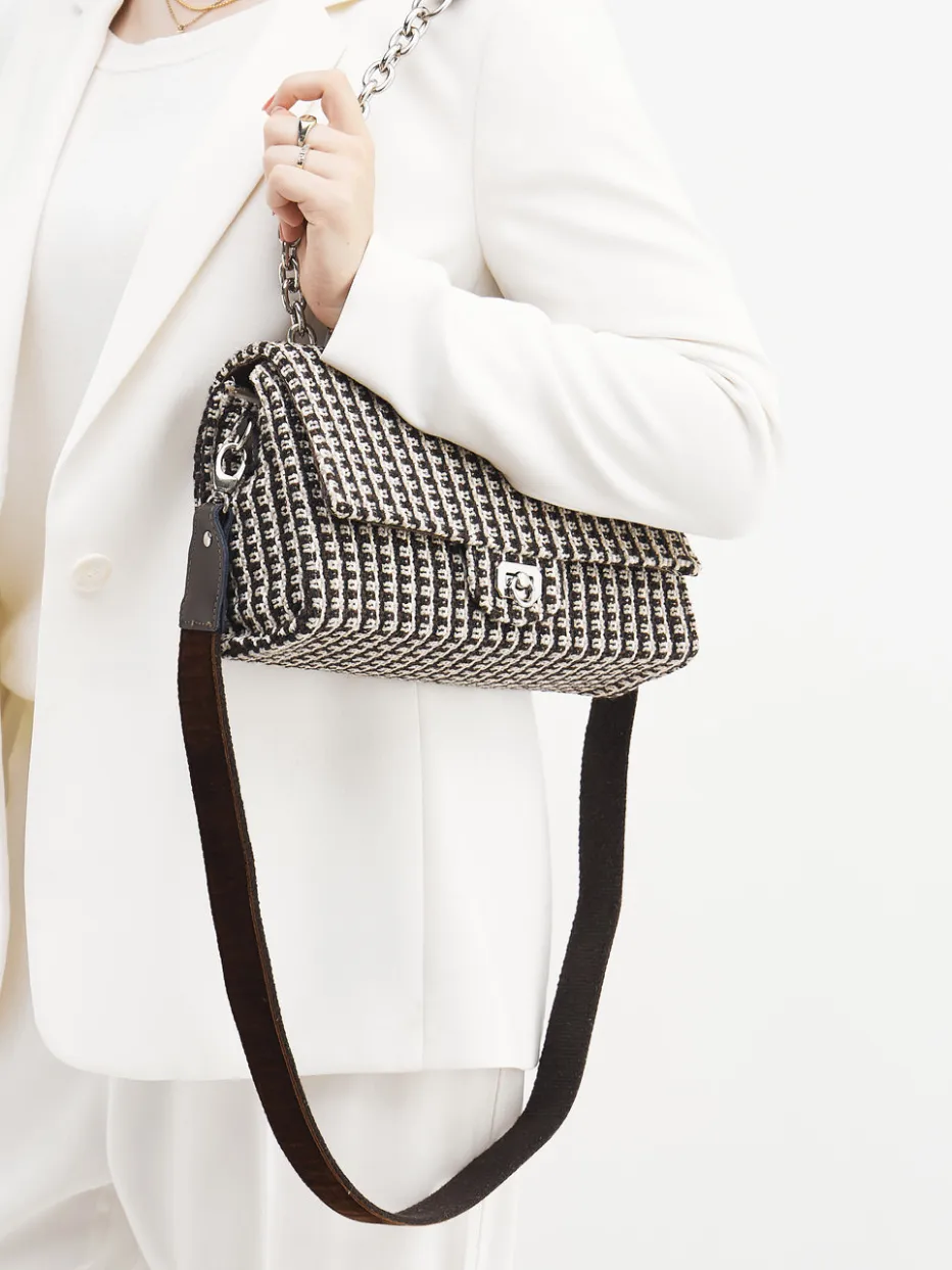 Die edle Bouclé-Struktur trifft auf markante Kettendetails und verleiht dieser Schultertasche von Viamailbag einen Hauch Pariser Vintage-Charme.