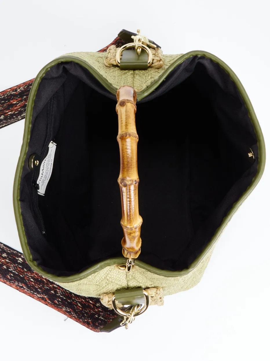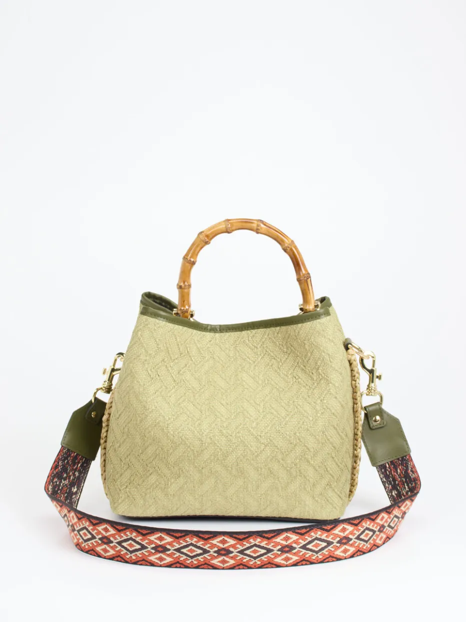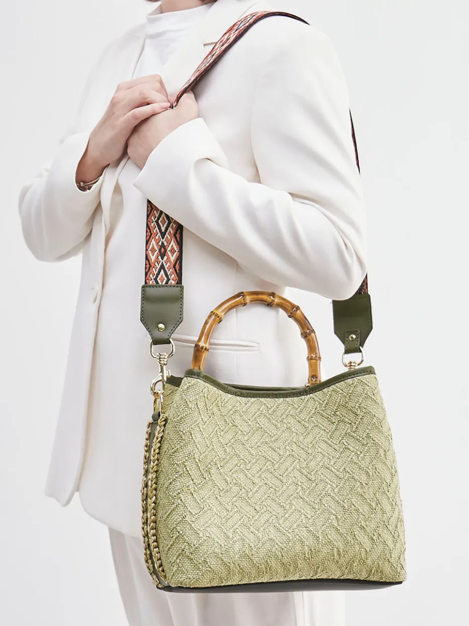 Diese Viamailbag-Handtasche verbindet strukturiertes Gewebe mit einem natürlichen Bambusgriff und feinen Ethno-Details – eine stilvolle Wahl für urbane Sommerlooks.