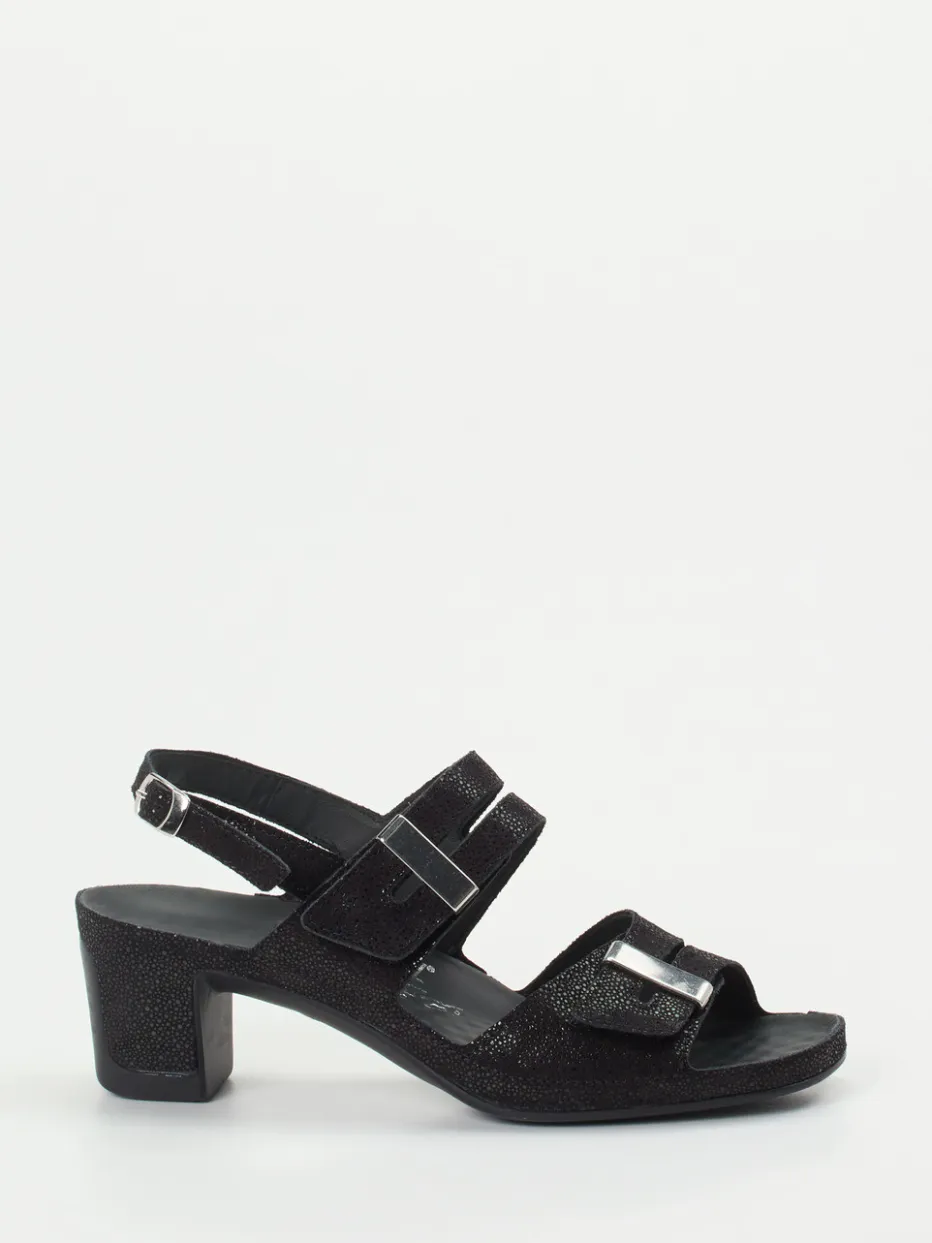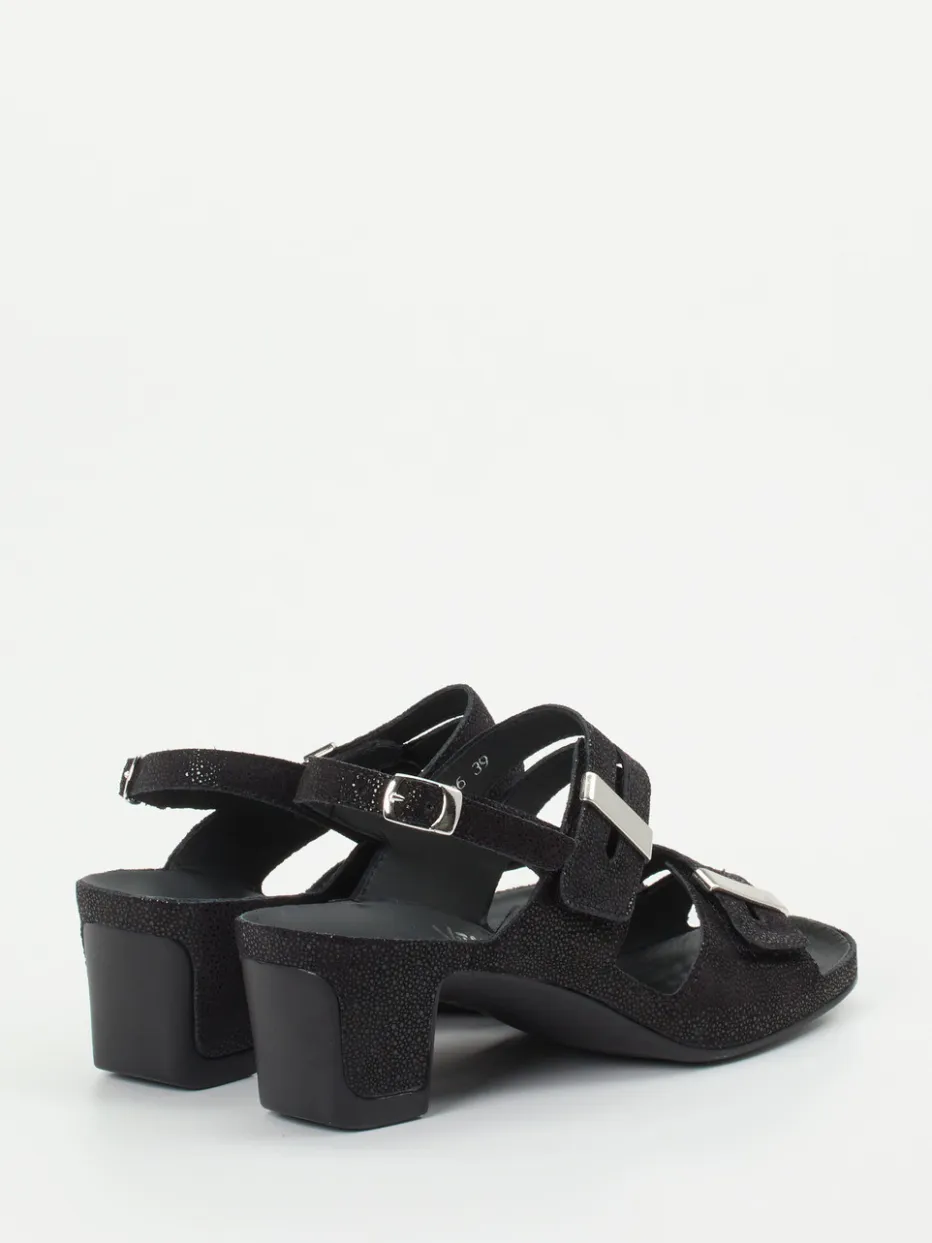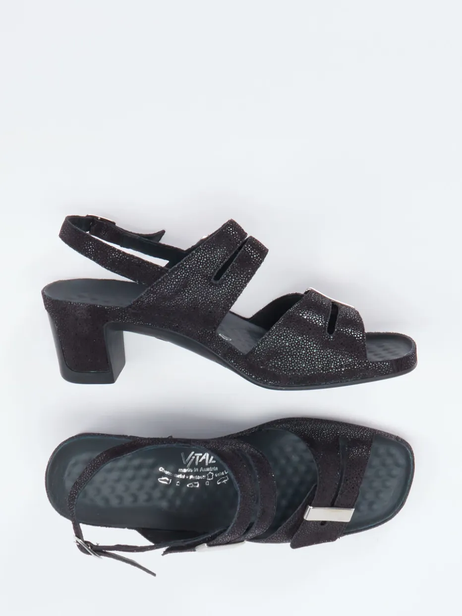 Strukturierter Glanz für stilvolle Momente.Vital präsentiert eine Damen-Komfortsandale mit Fokus auf Design und Ergonomie. Für lange Tage im Büro oder entspannte Stadtspaziergänge bietet diese schwarze Sandale einen gelungenen Mix aus Komfortdesign und modischem Anspruch. Das geprägte Leder mit leicht glänzender Oberfläche trifft auf silberfarbene Metallapplikationen, während Klettverschlüsse und ein verstellbarer Fersenriemen eine passgenaue Regulierung ermöglichen. Der stabile Blockabsatz und die trittsichere PU-Sohle ergänzen das ergonomisch geformte Fußbett. Stilistisch fügt sich das Modell in den Trend „Quiet Luxury“ mit dezenten Metallic-Akzenten. Ein rundum komfortbetontes Modell mit ästhetischer Klarheit – typisch Vital.