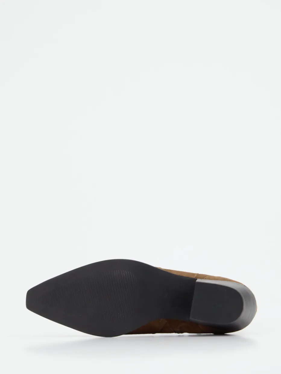 Western-Flair trifft auf zeitlosen Chic.Die Marke Vivian Ray zeigt mit dieser Damen-Stiefelette im Cowboy-Stil ein stilvolles Modell für den urbanen Alltag und abendliche Anlässe. Das mittelbraune Veloursleder, samtig angeschliffen, betont die matte Oberfläche und unterstreicht die Ton-in-Ton-Nähte. Die leicht spitz zulaufende, knöchelhohe Silhouette wirkt klar und zugleich feminin. Ein seitlicher Reißverschluss sorgt für angenehmen Komfort, während der 3 cm hohe Blockabsatz das modische Western-Thema harmonisch abrundet. Inspiriert von „Cowboy Core“ und „Quiet Luxury“ passt der Look perfekt zu weiten Kleidern oder Skinny Jeans. Ein charakterstarkes Statement-Piece mit authentischem Materialfokus – typisch Vivian Ray.
