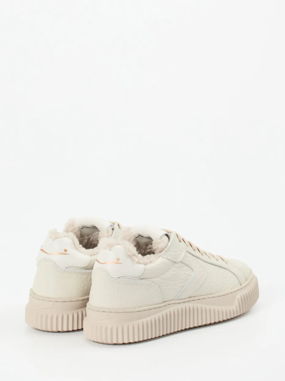 Winter-Update für den Streetstyle.Voile Blanche präsentiert mit diesem Sneaker ein Damenmodell für kühle Tage. Ideal für Alltag und City-Outfits bietet dieser Low-Top-Sneaker aus cremeweißem Kalbleder mit natürlicher Narbung ein komfortables Trageerlebnis. Die Lammfellfütterung am Einstieg sorgt für wohlige Wärme, während der dezent gefütterte Schaftrand und die robuste Gummisohle mit Grip-Profil den Wintereinsatz unterstützen. Dezente Designhighlights wie goldfarbene Logos an Ferse und Zunge sowie tonale Nähte unterstreichen den minimalistischen Look. Besonders in Kombination mit Soft-Wintertönen wie Beige oder Offwhite ein stilvoller Begleiter. Voile Blanche steht für sorgfältige Verarbeitung mit einem Gespür für moderne Lässigkeit.