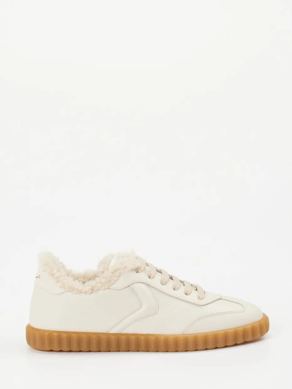 Kühle Temperaturen verlieren ihren Schrecken dank des innen vollständig mit Lammfell gefütterten Innenraums und des gepolsterten Fußbetts. Das hochwertig genarbte Kalbleder in warmem Cremeweiß wird von tonalen Nähten und goldfarbenem Logo-Print elegant akzentuiert. Die klassische, rund gehaltene Form mit platinfarbenen Schnürsenkeln und kontrastierender Gummisohle greift Retro-Sportswear-Zitate auf und passt perfekt zu ruhigen Herbst- und Winterlooks. Ideal kombinierbar mit Naturtönen oder kuscheligen Steppjacken.