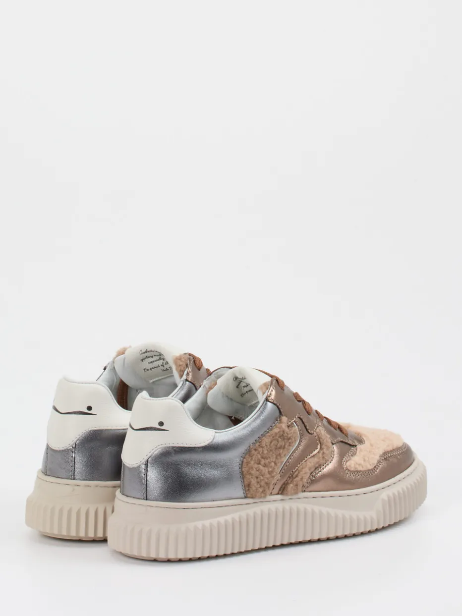 Bronzefarbenes Metallicleder bildet die glänzende Basis dieses Sneakers, während flauschiges Teddyfell an ausgewählten Partien einen spannenden Kontrast setzt. Die Farbwelt aus Roségold, Beige und Silber verleiht dem Schuh eine moderne Tiefe. Dank Schnürverschluss und gepolstertem Schaftrand bleibt der Tragekomfort im Fokus. Die geriffelte Gummisohle greift Retro-Runner-Vibes auf und macht ihn zum Highlight urbaner Herbst-Looks. Besonders stimmig mit Oversized-Jacken oder Metallic-Accessoires.
