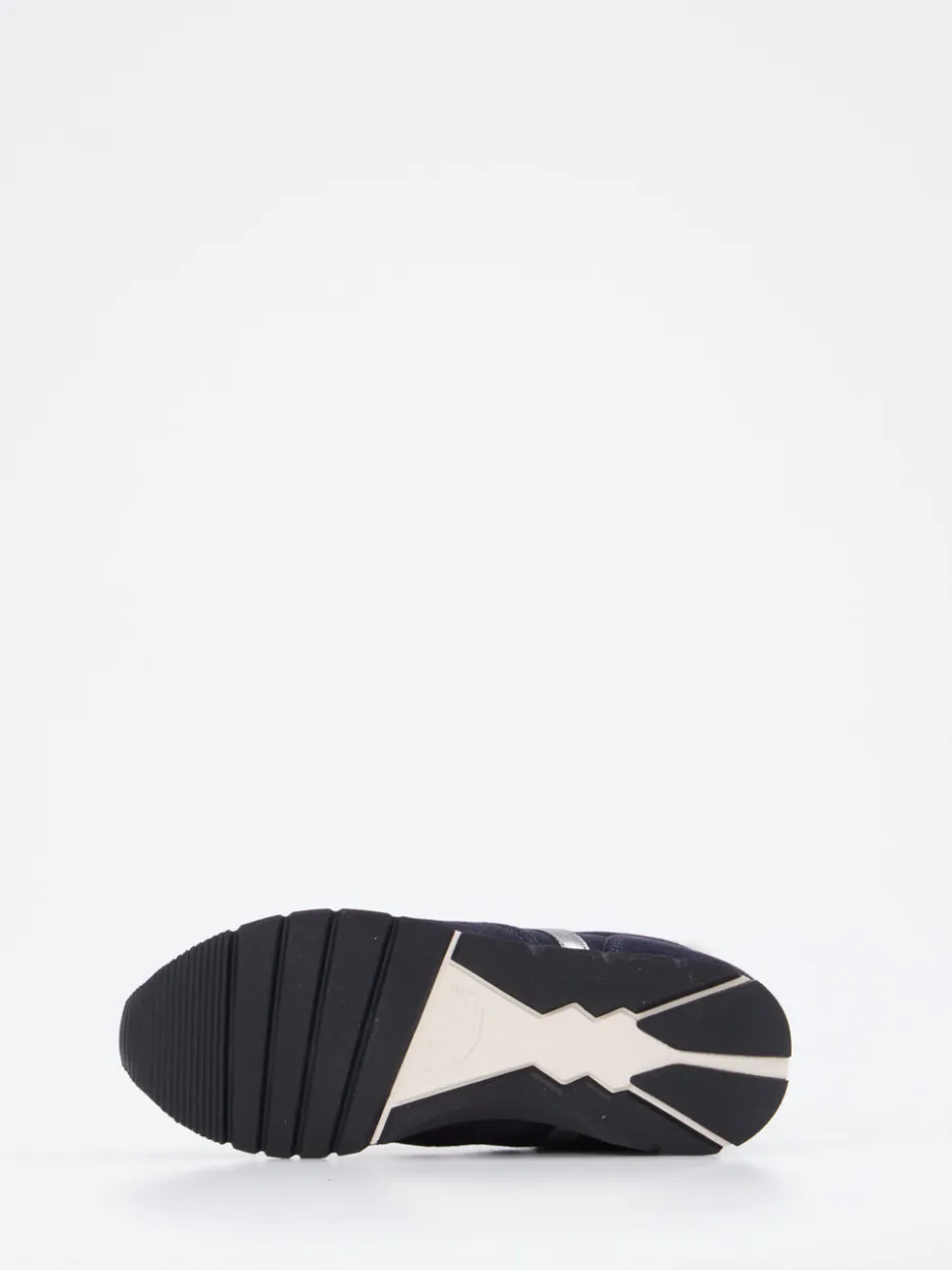 Eleganz trifft auf Wintertauglichkeit.Voile Blanche präsentiert diesen Damen-Winter-Sneaker im beliebten Retro-Runner-Stil. Für entspannte Spaziergänge bei frostigem Wetter bietet das dunkelblaue Veloursleder mit samtig-matter Oberfläche robusten Schutz und ein stilbewusstes Erscheinungsbild. Die hellgraue Lammfellfütterung und das fellbezogene Fußbett schenken komfortable Wärme. Silberfarbene Metallic-Applikationen setzen moderne Akzente, während weiße Kontrastdetails an Ferse und Zunge den Look betonen. Die leicht keilförmige Profilsohle aus Gummi garantiert Trittsicherheit. Passend zu Casual-Winterkleidung oder Steppjacke in Beige. Raffiniert verarbeitet für anspruchsvolle Stilbedürfnisse – typisch Voile Blanche.