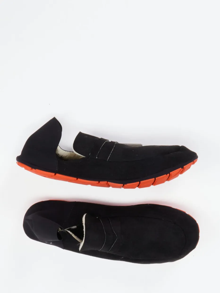Smartes Update für Zuhause und unterwegs.Der Slipper von Wai aus der Kategorie Pantolette verbindet modernen Streetstyle mit gemütlicher Funktion. Ideal für entspannte Stunden daheim oder entspannte City-Looks: Das schwarze, matte Synthetikmaterial liegt sanft am Fuß, während ein weiches Innenfutter in Lammfelloptik für Wärme sorgt. Die flache, ergonomische Silhouette wird durch die auffällige, signalrote Profilsohle betont – ein visuelles Statement mit Grip. Elastischer Einstieg und gepolsterte Ferse ergänzen den hohen Tragekomfort. Stilistisch trifft dieser Schuh auf Trends wie „Quiet Luxury“ und „Gorpcore“. Wai steht hier für durchdachten Komfort mit urbanem Understatement.