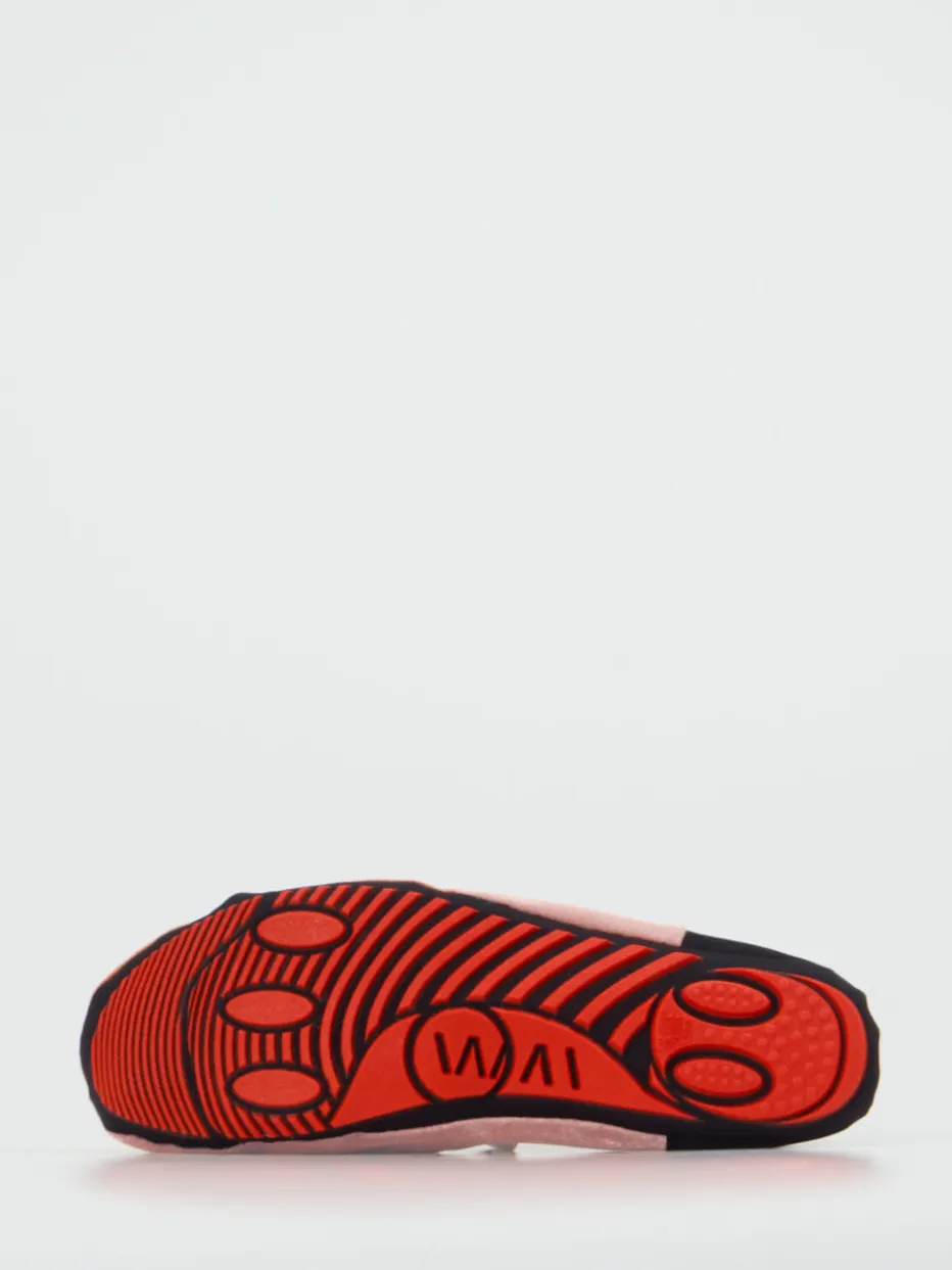 Statement für urbanen Indoor-Style.Die italienische Marke Wai bringt mit diesem Slipper modischen Ausdruck in den Alltag. Ideal für entspannte Momente zuhause oder lässige Streetwear-Kombinationen: Das rosafarbene Textil mit samtiger Haptik schmiegt sich angenehm an den Fuß. Die spitz zulaufende Silhouette und die auffällige Gummisohle in Rot-Schwarz greifen aktuelle Y2K- und Quiet-Luxury-Trends auf. Der elastische Fersenbereich erhöht den Komfort bei jedem Schritt. Perfekt zu Jogpants oder einem oversized Hoodie. Ein Design mit Charakter für stilbewusste Individualität von Wai.
