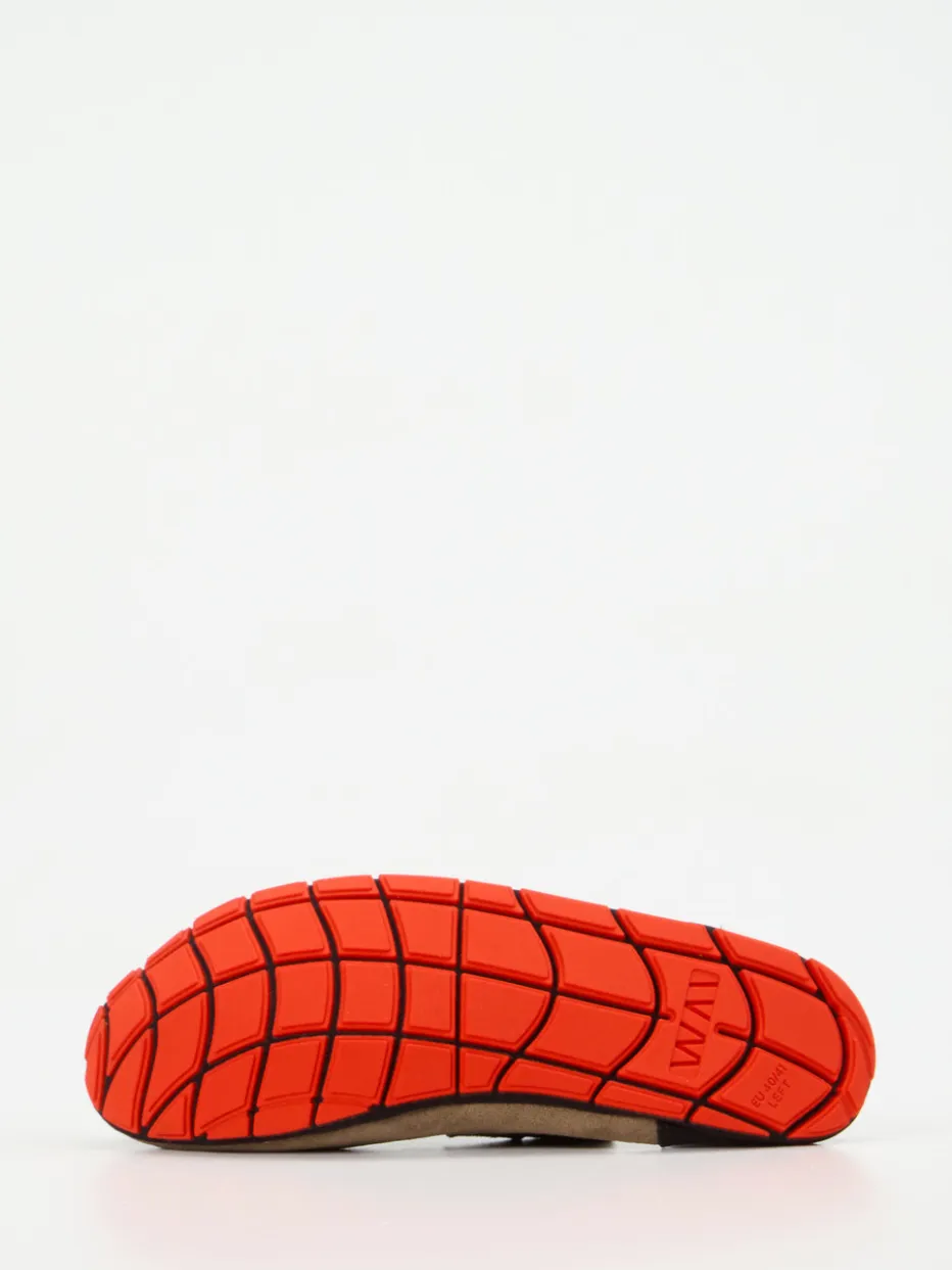 Die Hybrid-Slipper von Wai vereinen samtiges Veloursleder mit flexiblem Neopren-Fersenbereich und setzen durch die signalorange Kontrastsohle ein progressives Streetwear-Statement.