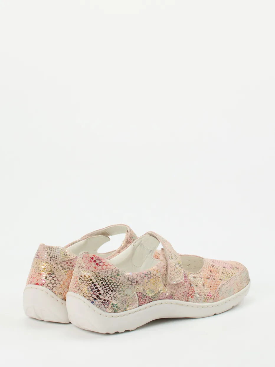Komfort trifft Farbvielfalt.Waldläufer präsentiert diesen alltagstauglichen Damen-Klettslipper aus geprägtem Leder in brillanter Multicolor-Optik. Ideal für entspannte Tage unterwegs oder zu Hause: Das glänzende Leder mit auffälligem Schlangenmuster und Metallic-Effekten in Rosé und Gold sorgt für einen lebendigen Look. Die helle, flexible Profilsohle aus PU bietet Halt, das ergonomisch geformte Wechselfußbett sowie der gepolsterte Einstieg garantieren maximalen Komfort. Seitliche Perforationen fördern die Atmungsaktivität – ein Stil für komfortaffine Casualwear mit Trend-Appeal. Perfekt kombiniert zu hellen Stretchhosen oder pastellfarbenen Accessoires. Erkennbar Waldläufer – bequem, stabil und stilvoll.