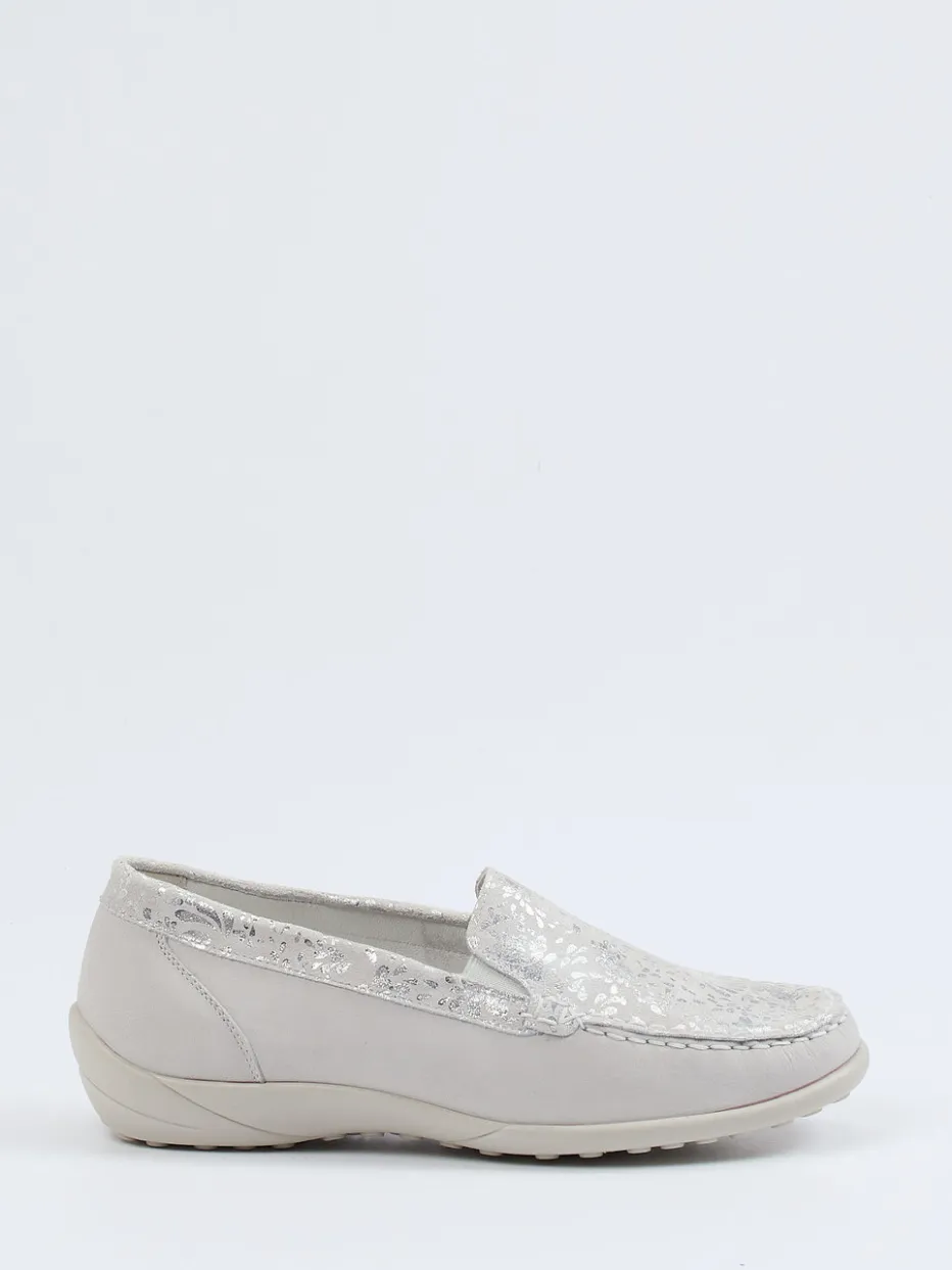 Präziser Komfort in elegantem Glanz.Waldläufer präsentiert einen Komfort-Loafer für Damen, der dezente Eleganz mit funktionalen Vorzügen verbindet. Ob für entspannte Spaziergänge oder einen aktiven Alltag – das Modell kombiniert samtig angeschliffenes Nubukleder mit floral bedrucktem Veloursleder im silberfarbenen Metallic-Finish. Die klassische Mokassin-Silhouette wirkt durch die hellgraue Farbgebung besonders feminin. Innen sorgt ein herausnehmbares, anatomisch geformtes Fußbett für optimalen Tragekomfort – auch für eigene Einlagen geeignet. Die strukturierte PU-Sohle ist rutschhemmend und flexibel, der Einstieg gelingt in Schlupfform besonders bequem. Ideal im Trend der sanft schimmernden Casual Styles. Waldläufer-typisch vereint der Schuh Komfortweite mit zeitgemäßem Chic.