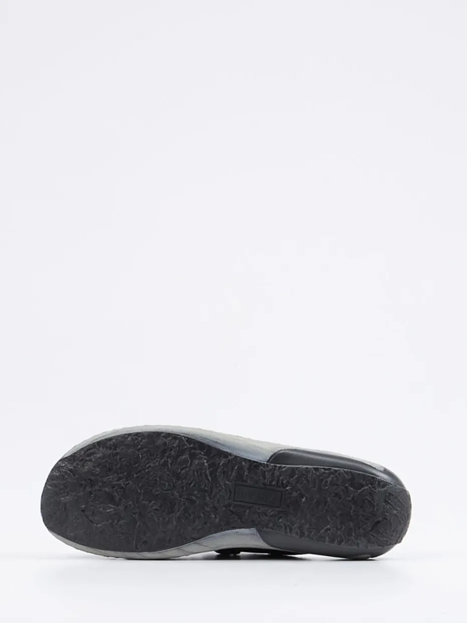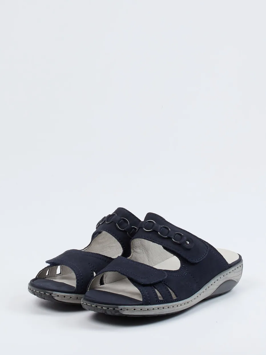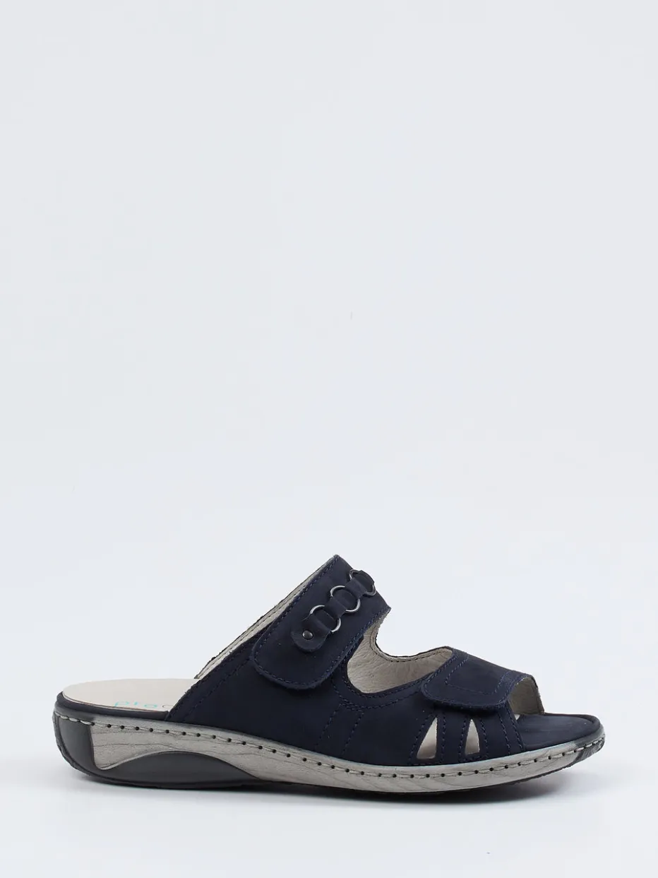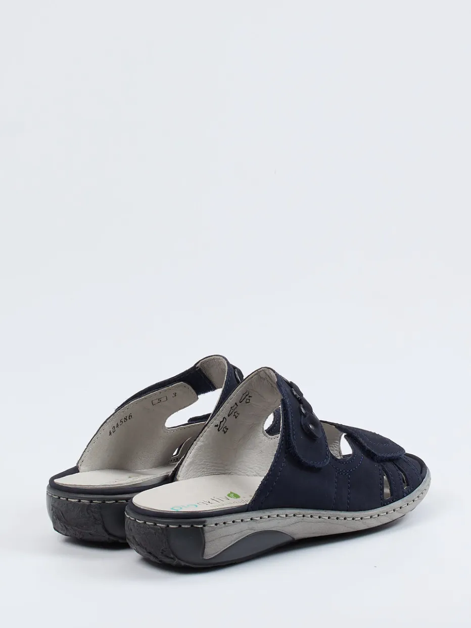 Komfort trifft auf Alltagstauglichkeit.Die Marke Waldläufer präsentiert mit dieser Komfort-Pantolette ein durchdachtes Damenmodell für entspannte Sommertage. Die ergonomisch geformte Sohle bietet unterstützenden Halt – ideal für Zuhause oder entspannte Wege unterwegs. Gefertigt aus samtig angeschliffenem Nubukleder in elegantem Dunkelblau überzeugt sie durch zwei praktische Klettriemchen für flexible Passform. Das kleine Kettchendetail am oberen Riemen verleiht dem funktionalen Design einen femininen Akzent. Die leicht profilierte PU-Sohle zeigt sich rutschhemmend und bewährt sich auch bei längeren Tragezeiten. Das Wechselfußbett und die weiche Lederfütterung unterstreichen den Anspruch an Komforttypik der Marke.