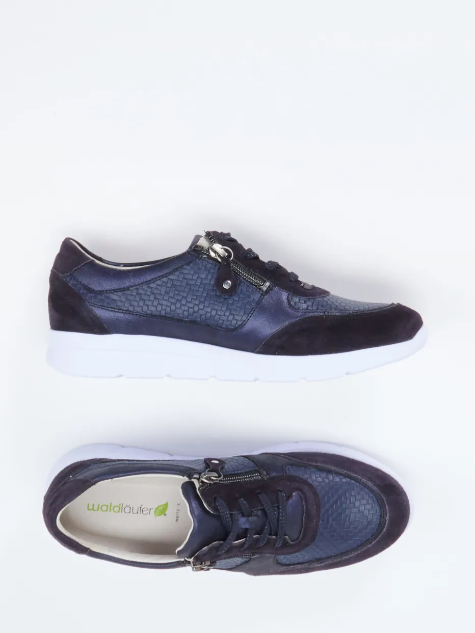 Leichtfüßig unterwegs im Alltag.Der Komfort-Sneaker von Waldläufer überzeugt als stilvoller Begleiter für entspannte Freizeitmomente. Die Kombination aus dunkelblauem Kalbleder mit samtig angeschliffenen Veloursleder-Partien und geprägter Flechtstruktur verleiht dem Schuh Tiefe und Charakter. Die klassische, niedrig geschnittene Silhouette wird durch seitliche Reißverschlüsse ergänzt, die ein komfortables Hineinschlüpfen ermöglichen. Eine helle PU-Sohle mit ergonomischem Profil unterstreicht den sportiv-relaxeden Look und sorgt für angenehme Dämpfung beim Gehen. Dezente Glanzelemente fügen sich harmonisch ins Gesamtbild ein. Ein Schuh für jeden Tag – mit Fokus auf Bequemlichkeit, Passform und stilvoller Zurückhaltung.
