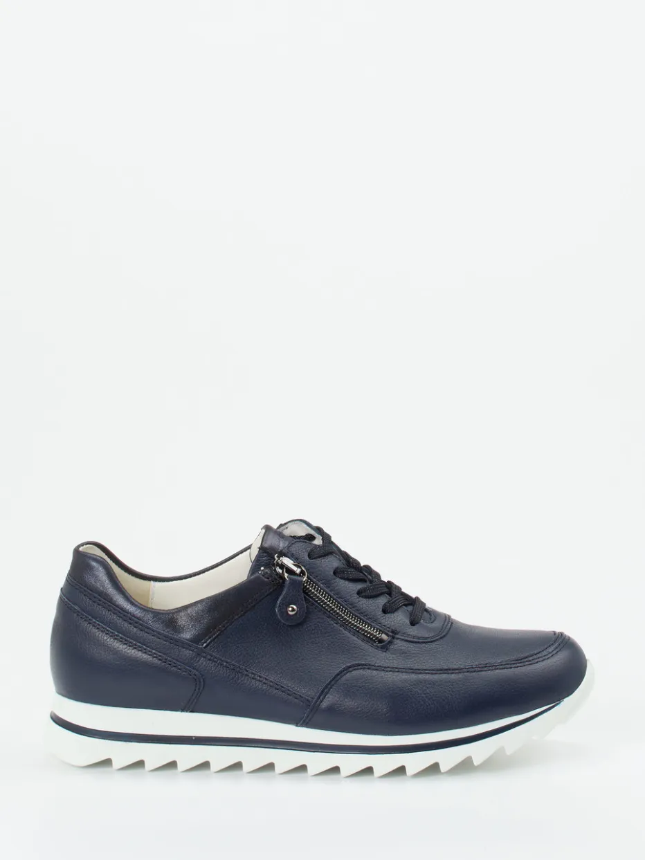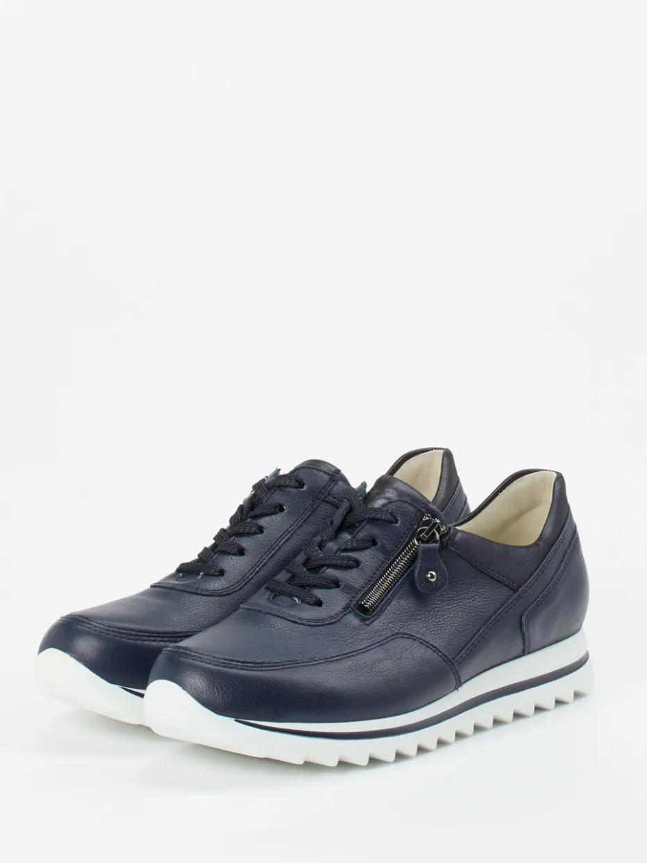 Durch das dunkelblaue, natürlich genarbte Kalbleder wirkt der Schuh sportiv und dezent zugleich. Die Kombination aus toniger Schnürung und praktischem Reißverschluss erleichtert das Anziehen. Die weiße Zickzack-Profilsohle mit silberfarbenem Akzent sorgt für sicheren Halt; das gepolsterte Innenleben mit Leder-/Textilfutter erhöht den Tragekomfort. Sein klassisch-sportlicher Schnitt harmoniert mit Freizeit-Outfits und eignet sich ideal für komfortorientierte Looks.