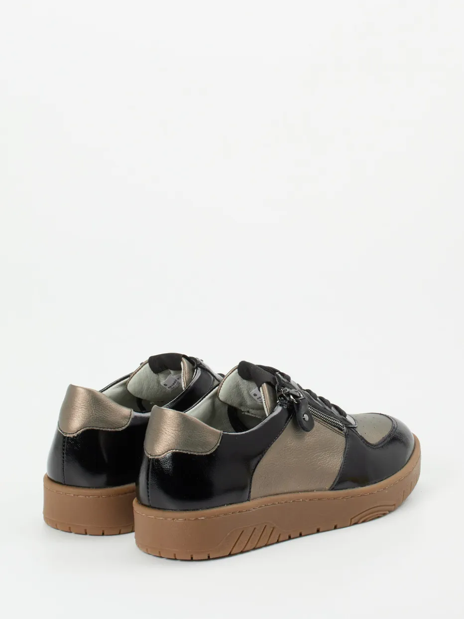 Facettenreich glänzender Alltagsbegleiter.Der Komfort-Sneaker für Damen von Waldläufer verbindet modischen Metallic-Style mit funktionaler Alltagstauglichkeit und angenehmer Weite H. Für entspanntes Unterwegssein bietet das Modell eine genarbte, glänzende Oberfläche in Bronzebraun und Schwarz auf Basis von Metallicleder. Der Mix aus Schnürung und seitlichem Reißverschluss erleichtert den Einstieg, während Textil- und Lederfutter sowie das gepolsterte Fußbett den Komfort unterstreichen. Die rutschhemmende Honig-Gummisohle ergänzt die klassische Rundform, während dezente Metallic-Akzente, Perforationen im Vorderblatt und ein weich gepolsterter Schaftrand stilvolle Details bieten. Der Look greift aktuelle „Comfort Revival“- und „Metallic Accents“-Trends auf. Waldläufer-typischer Komfort trifft hier auf zurückhaltende Modernität.