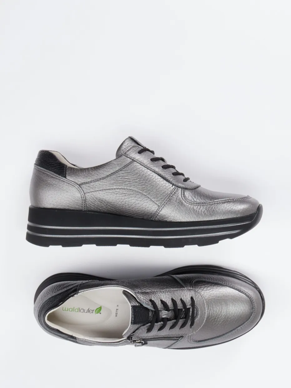 Metallic-Glanz trifft Komfort-Technologie.Waldläufer präsentiert einen Damen-Sneaker in der Kategorie Komfortschuhe. Dieser anthrazitgraue Sneaker überzeugt mit genarbtem Metallicleder und weich gepolstertem Leder-/Textilfutter – ideal für lange Tage mit hohem Trageanspruch. Die Kombination aus klassischer Rundform, dämpfender Gummisohle mit silberfarbenen Akzenten und der seitliche Reißverschluss ergänzen sich zu einem praktischen wie modischen Gesamtpaket. Schwarze Kontrastdetails an Ferse und Schnürung verleihen dem minimalistisch inspirierten Modell eine moderne Streetwear-Note. Dank Weite H und herausnehmbarem Fußbett eignet er sich auch für Einlagen. Vielseitiger Komfortschuh mit dezenter Fashion-Attitüde – typisch Waldläufer.