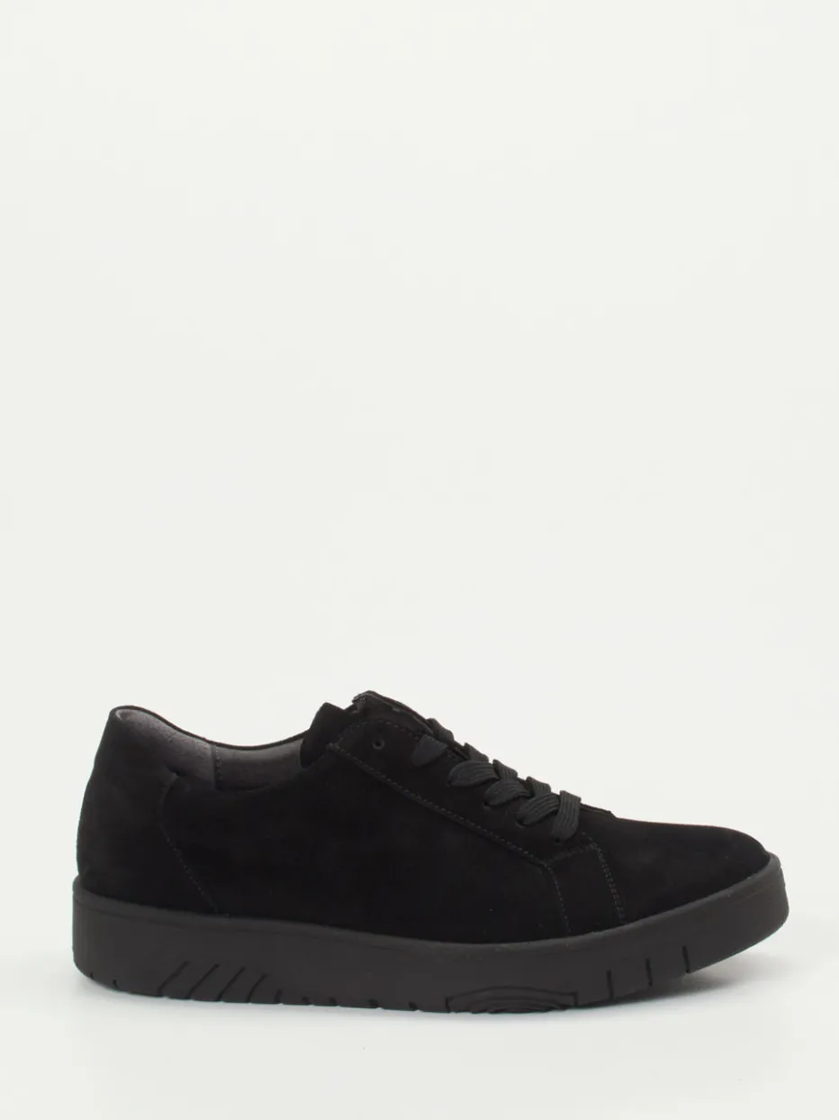 Für entspannte Spaziergänge oder lange Bürozeiten bietet dieser Schnürschuh aus hochwertigem Veloursleder mit matt samtiger Oberfläche und Textil-Lederfutter optimalen Komfort. Die gepolsterte Lasche, der weich gefütterte Schaftrand und das herausnehmbare Fußbett machen ihn besonders tragefreundlich. Seine schwarze Farbgebung, die Ton-in-Ton-Nähte und die strukturierte Gummisohle spiegeln zeitlosen Minimalismus. Kombiniert mit lockeren Jeans oder modernen Athleisure-Looks bleibt der Sneaker stilvoll unauffällig. Der perfekte Begleiter für komfortbetonte Outfits.
