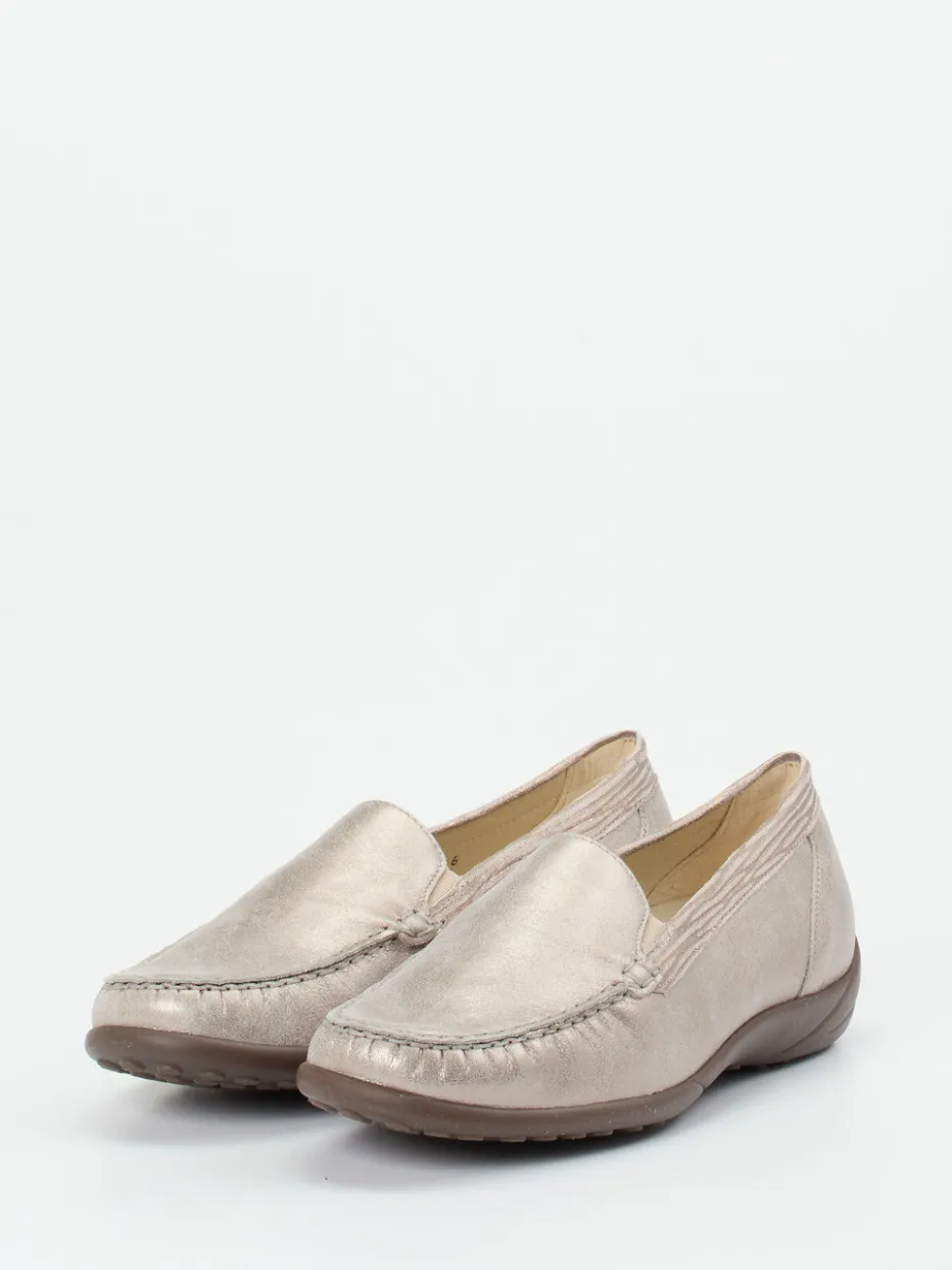 Bequem durch den Tag mit dezentem Glanz.Waldläufer bietet mit diesem Komfortslipper für Damen ein Modell, das elegantes Design mit funktionaler Alltagstauglichkeit verbindet. Für komfortbewusste Tage im Büro oder beim Stadtbummel bietet das handschuhweiche Metallicleder in Champagnerbeige einen edlen Glanz und zugleich angenehme Flexibilität. Die flache Silhouette wird durch tonige Ziernähte und subtile Metallic-Effekte stilvoll ergänzt. Dank Elastikeinsätzen an den Seiten ist das An- und Ausziehen mühelos. Die rutschhemmende Gummisohle sowie die Weite K mit schmaler Ferse sorgen für optimalen Halt und Tragekomfort, auch mit losen Einlagen. Durch das dezente Farbspiel besonders gut zu Naturtönen kombinierbar. Waldläufer steht für funktionalen Komfort mit stilsicherem Understatement.
