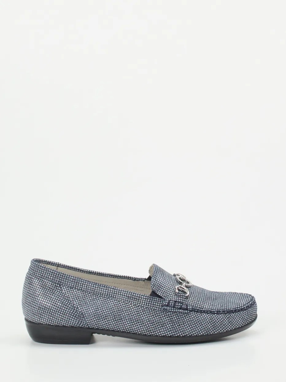 Komfort trifft strukturierte Eleganz.Der Damen-Loafer von Waldläufer verbindet Preppy-Stil mit modernem Komfort. Für lange Büro- oder Alltagseinsätze bietet der Slipper dank geprägtem Leder in meliertem Jeansblau mit ergonomischem Fußbett ermüdungsfreies Tragen. Die klassische Schlupfform mit flacher Silhouette erlaubt leichten Einstieg, während eine silberfarbene Zierspange und sportive Mokassinnaht dezente Akzente setzen. Die rutschhemmende Gummisohle und austauschbares Fußbett unterstreichen Funktion und Vielseitigkeit dieses Modells. Als Trendpiece passt der Loafer ideal zur Textur-Mix-Mode der Saison und ergänzt gedeckte Töne oder Denim-Styles souverän. Authentischer Waldläufer-Komfort in souveränem Preppy-Design.