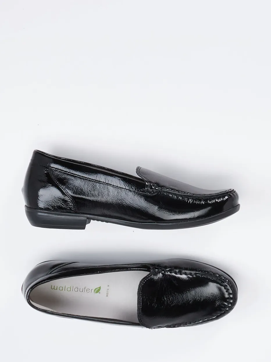 Bequem und glänzend: Klassiker neu gedacht.Waldläufer erweitert seine Kollektion um einen stilvollen Damen-Loafer für Alltag und Büro. Der Loafer überzeugt mit schwarzem Softlackleder, das samtig glänzt und durch dezente Mokassin-Nähte betont wird. Die klassische Silhouette mit flachem Absatz ergänzt sich ideal mit der flexiblen Gummisohle und der komfortablen H-Weite. Ein individuell austauschbares, lederbezogenes Fußbett sorgt für zusätzlichen Komfort. Das puristische Design folgt den Trends „Quiet Luxury“ und „Return of Comfort“. Kombinierbar mit eleganten Stoffhosen oder femininen Business-Looks. Markentypisch pflegeleicht und auf nachhaltige Alltagstauglichkeit ausgelegt.