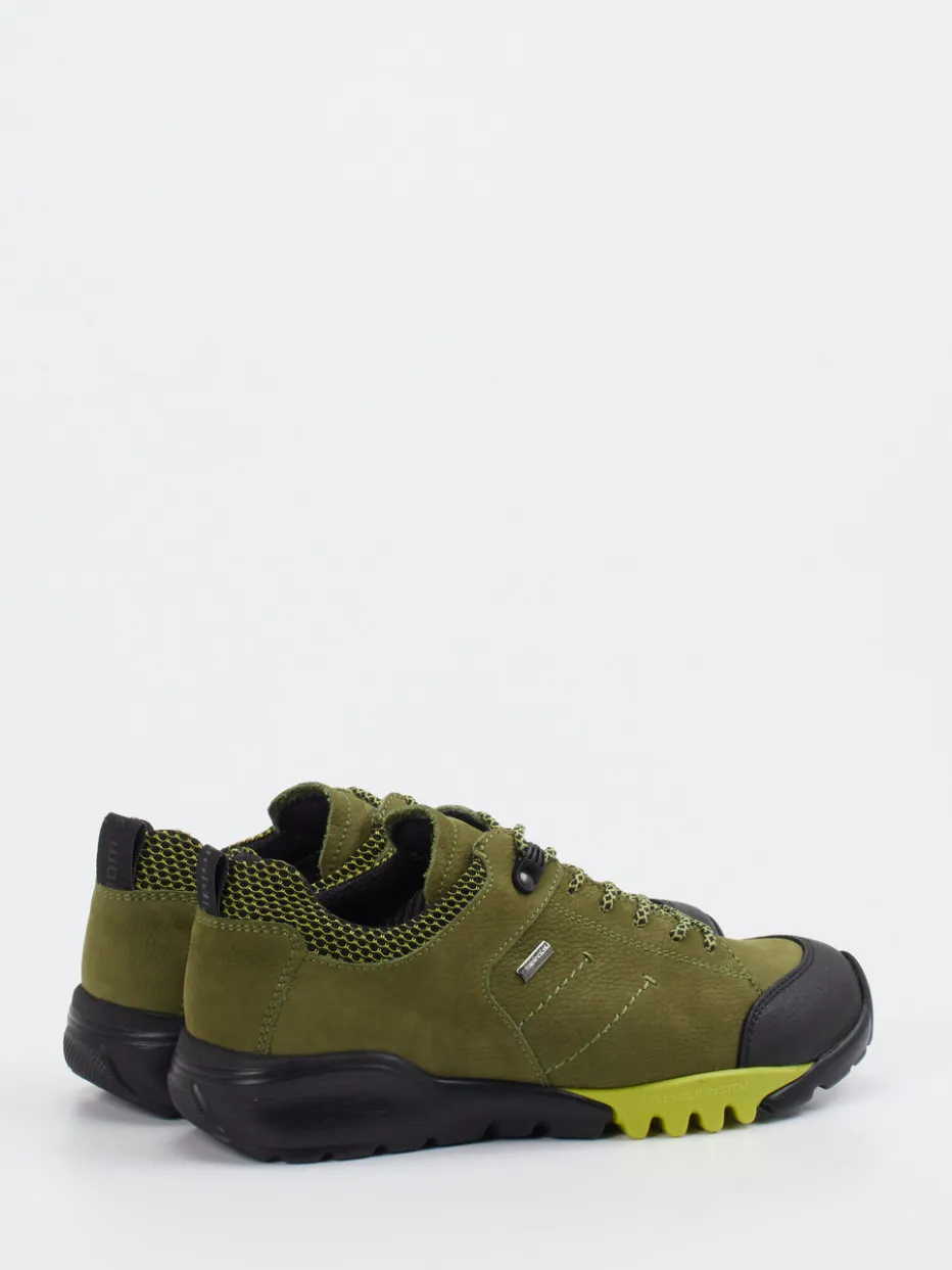 Wandertauglicher Stil trifft Funktion.Waldläufer präsentiert einen schnürbaren Outdoor-Sneaker für aktive Tage im Freien. Ideal für spontane Trails oder längere Spaziergänge: Der Schuh besteht aus wind- und wasserdichtem Material mit samtig angeschliffenem Veloursleder und atmungsaktiven Mesh-Partien. In markantem Olivgrün mit neongrünen Akzenten verbindet er sportliche Signalwirkung mit funktionaler Silhouette. Verstärkte Zehenkappe, zweifarbige Schnürsenkel und griffig profilierte Gummisohle runden das durchdachte Design ab. Perfekt kombinierbar mit Funktionswear im Utility-Stil. Maximaler Outdoor-Komfort und modisches Statement für jeden Schritt.
