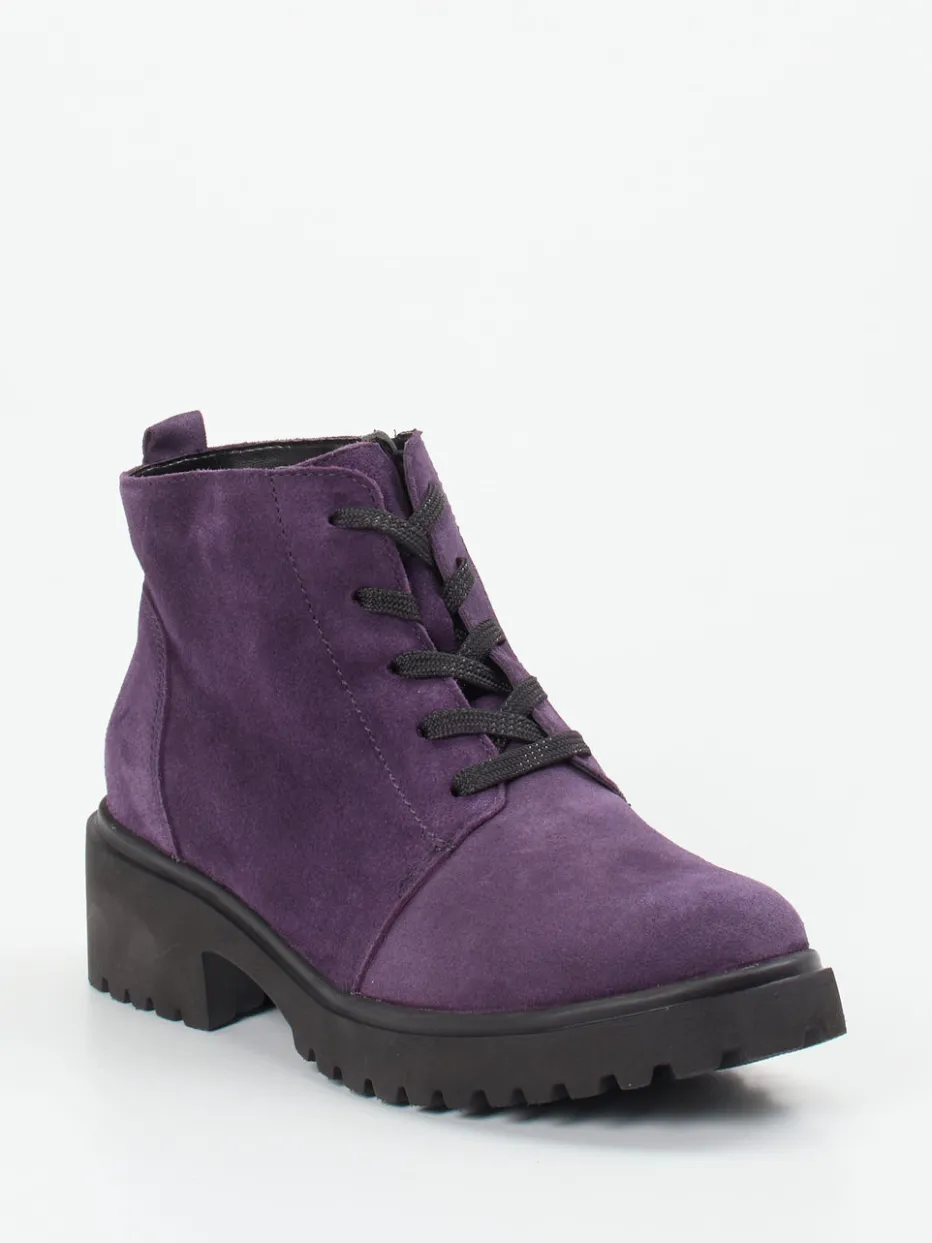 Der knöchelhohe Schaft aus Veloursleder, samtig angeschliffen, trifft auf eine griffige Gummisohle mit markantem Profil. Die intensive Pflaumenfarbe setzt ein saisonales Statement und harmoniert mit matten Ton-in-Ton-Nähten sowie schwarzen Schnürsenkeln. Reißverschluss und Schnürung sorgen gemeinsam für bequemen Einstieg und optimalen Halt. Der Utility-inspirierte Look greift aktuelle Streetwear- und Color-Trends auf und ergänzt casual Styles wie Strick oder Denim mühelos.