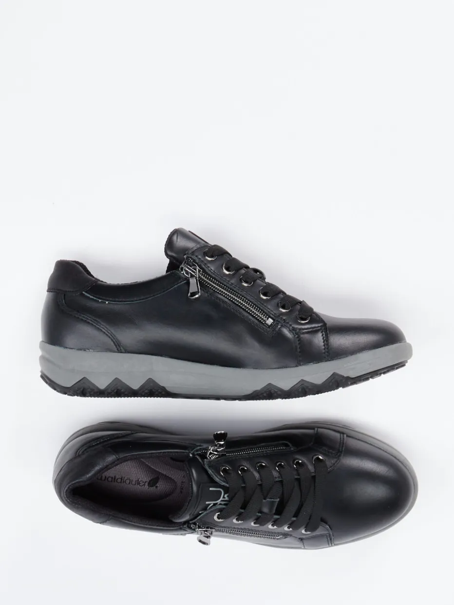Funktional im Alltag, komfortabel im Detail.Waldläufer präsentiert mit diesem Schnürschuh aus der Komfort-Kollektion ein wetterfestes Modell für Herbst und Winter. Optimal für entspannte Spaziergänge oder den Stadtbummel bietet der Schuh durch das wind- und wasserdichte Glattleder zuverlässigen Schutz bei jedem Wetter. Die matte Oberfläche in schlichtem Schwarz trifft auf eine zackenförmige Gummisohle in Mittelgrau und einen klassischen, rund gearbeiteten Schnitt. Der seitliche Reißverschluss ergänzt die Schnürung für besonderen Komfort beim Anziehen, während der weich gepolsterte Schaftrand Druckstellen vorbeugt. Streetwear trifft Minimalismus – mit Fokus auf Funktionalität. Waldläufer steht für durchdachtes Gehen mit hohem Tragekomfort – auch an langen Tagen.