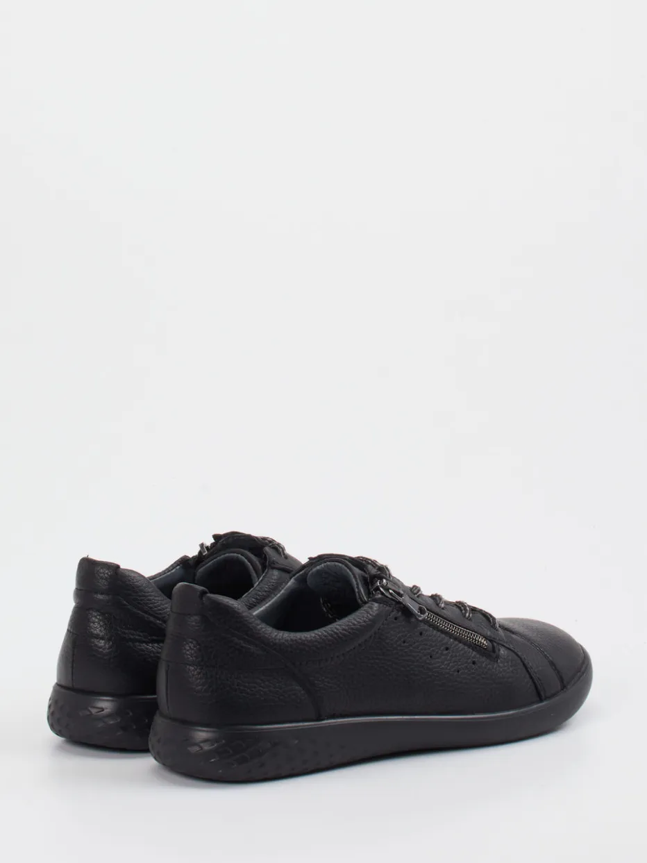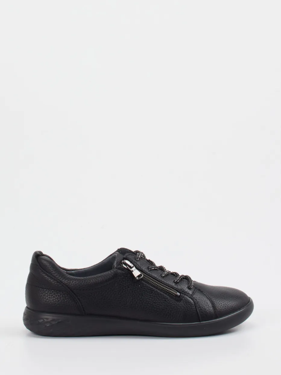 Minimalismus trifft Alltagstauglichkeit.Waldläufer präsentiert bei diesen Komfort-Sneakern eine klare Formensprache und funktionale Details. Für lange Wege durch die City oder entspannte Stunden zu Hause bietet das Modell dank genarbtem Kalbleder und sattschwarzem Farbton eine robuste wie stilvolle Grundlage. Die flache, runde Silhouette wird durch einen seitlichen Reißverschluss ergänzt, der in Silber dezent akzentuiert. Innen sorgt ein Leder-/Textilfutter für angenehmes Fußklima; die flexible Gummisohle punktet mit Polsterung und Trittsicherheit. Modisch minimalistisch – passend zur „Quiet Comfort“-Welle. Kombiniert wird der Look ideal mit Stretch-Jeans und Funktionsjacke. Die Kombination aus Komfortweite H und praktischen Details unterstreicht den Anspruch der Marke auf gehobene Alltagstauglichkeit.