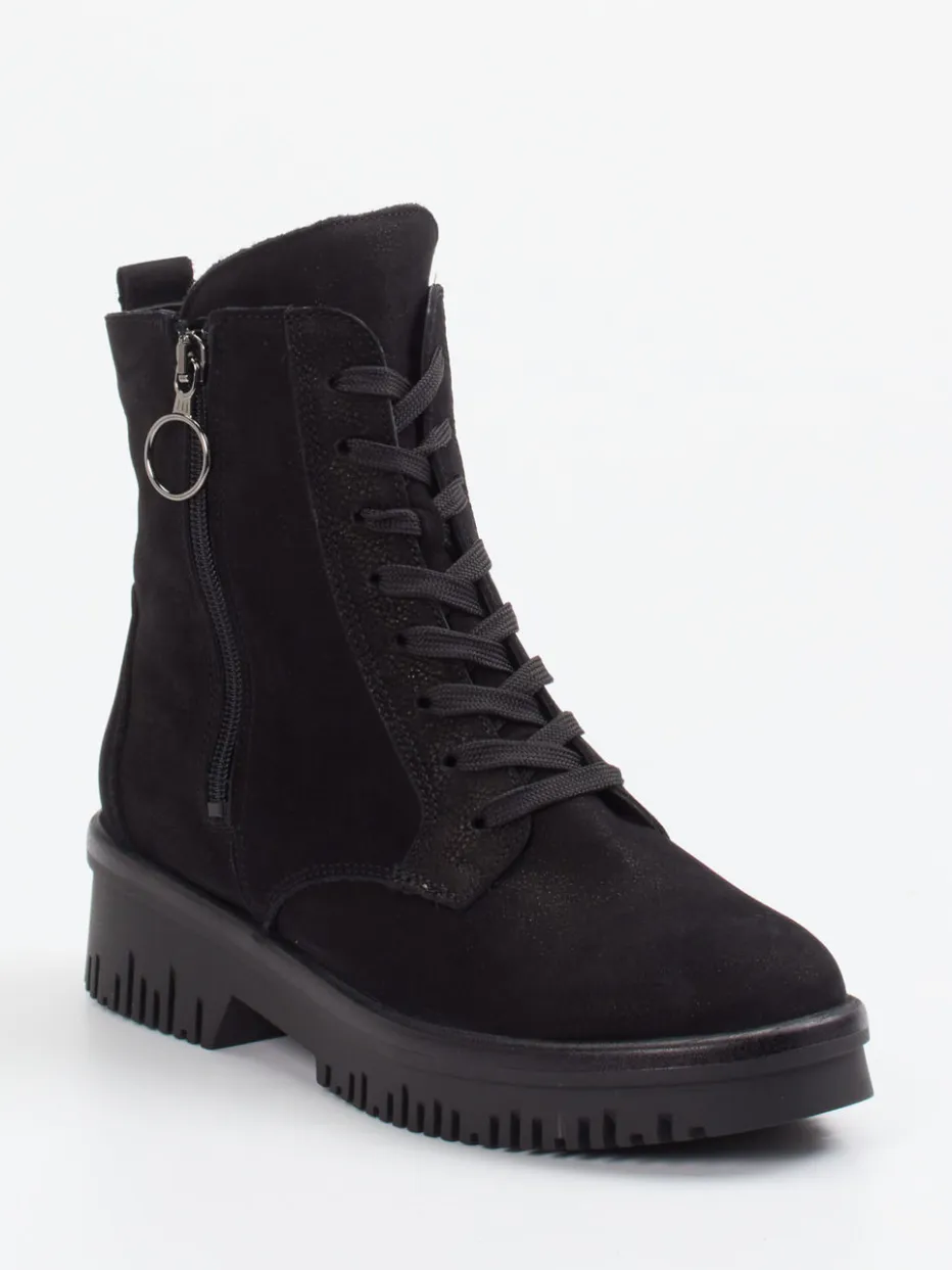 Stadtbereit bei jedem Wetter.Die Marke Waldläufer steht für Komfortschuhe mit modischem Anspruch – wie diese elegante Schnürstiefelette für Damen aus der Herbst/Winter-Kollektion. Ideal für lange Tage unterwegs bietet das Modell durch die Kombination aus Schnürung und seitlichem Reißverschluss hohen Tragekomfort. Das schwarze Nubukleder ist samtig angeschliffen, die matte Oberfläche unterstreicht den minimalistischen Look. Dank der markanten Profil-Gummisohle bewegt man sich sicher auf winterlichen Untergründen. Silberfarbene Details wie der Zipper-Ring setzen dezente Akzente im Utility-Stil. In Weite H geschnitten, ist dieser Boot auch orthopädisch flexibel kombinierbar – etwa zu einer gesteppten Jacke und Strickmütze. Waldläufer beweist einmal mehr, dass Funktionalität und Stil perfekt harmonieren.