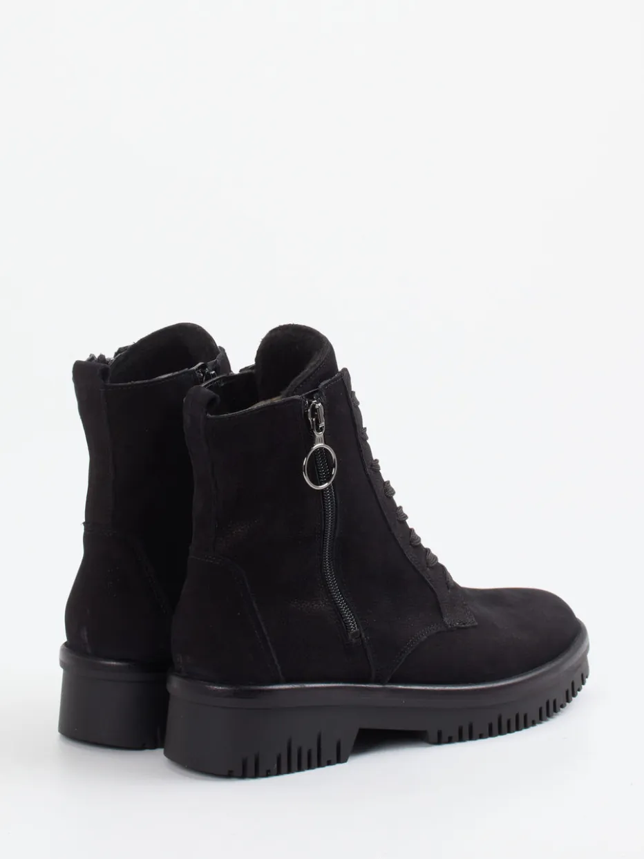 Diese schwarze Schnürstiefelette kombiniert samtig angeschliffenes Nubukleder mit alltagstauglichem Komfort und einem urbanen Design mit Utility-Charakter.