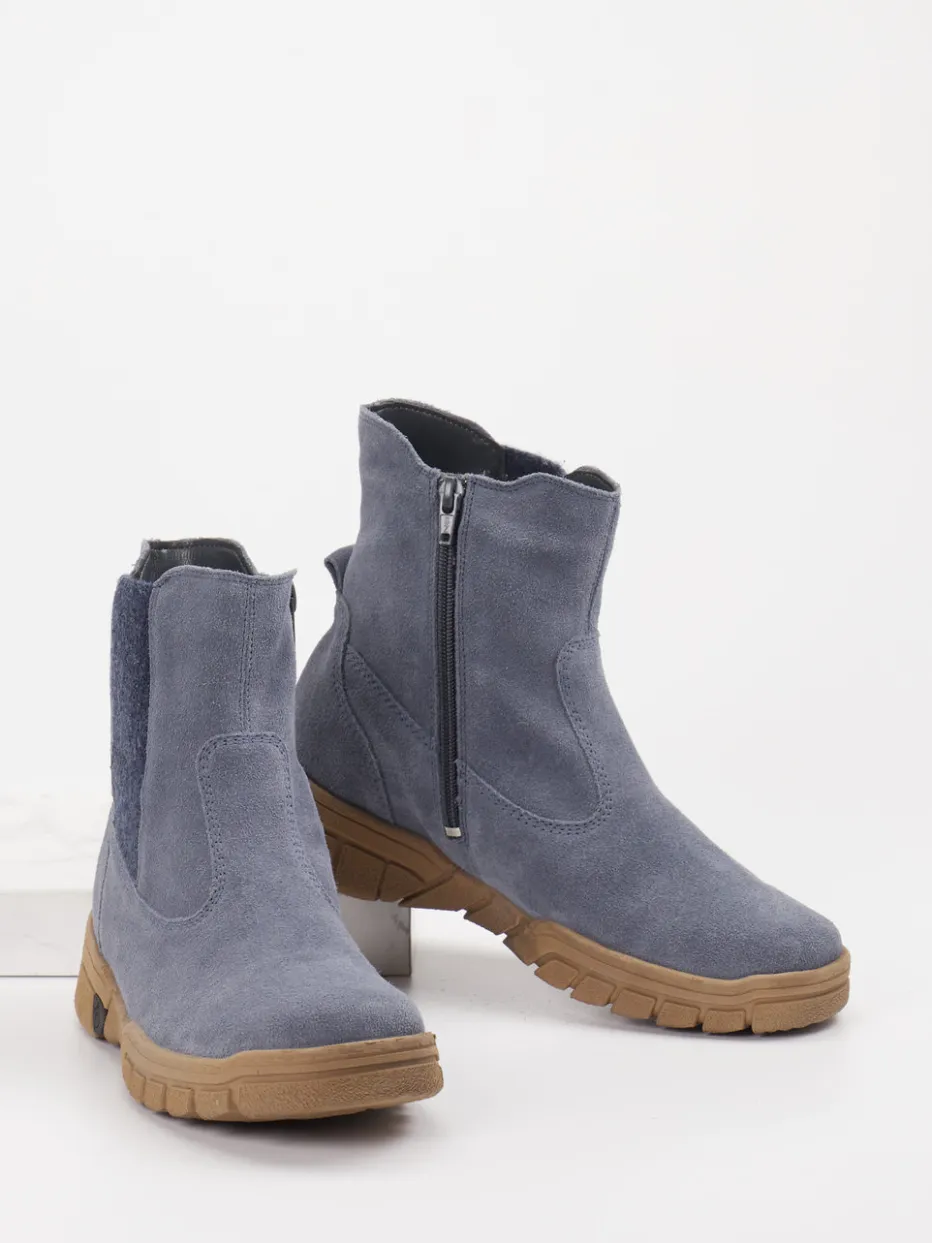 Die Marke Waldläufer bringt mit dieser Stiefelette eine moderne Interpretation klassischer Chelsea Boots auf den Markt. Ideal für kühle Herbsttage bietet dieses Modell aus weichem Veloursleder in Blaugrau hohen Komfort und urbanen Chic. Die Kombination aus seitlichem Elastikeinsatz und Innenreißverschluss erleichtert den Einstieg und unterstützt einen angenehmen Sitz. Die robuste Profilsohle, der matt strukturierte Schaft sowie tonige Nähte setzen funktionale Akzente. Das warme Textilfutter sorgt für ein angenehmes Tragegefühl, auch bei längeren Spaziergängen. Besonders harmonisch wirkt die Stiefelette zu Wollmänteln oder Outdoorjacken im gedeckten Farbspektrum. Der typische Waldläufer-Komfort rundet das vielseitige Design ab.