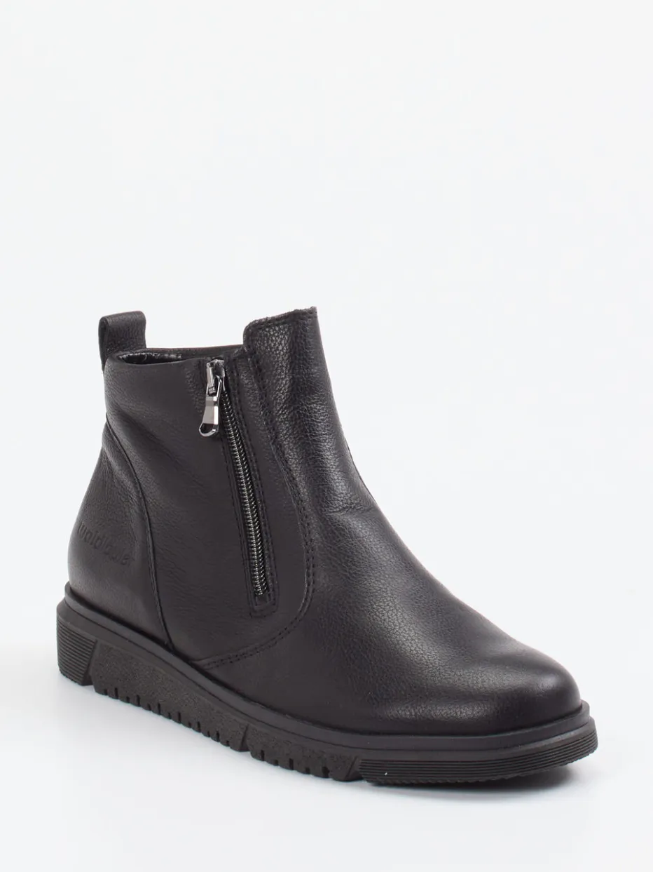 Komfortabel durch Herbst und Winter.Die Marke Waldläufer präsentiert eine moderne Komfort-Stiefelette für Damen. Ob beim Stadtbummel oder auf dem Weg zur Arbeit – diese knöchelhohe Stiefelette erfüllt den Wunsch nach bequemer Alltagstauglichkeit. Das schwarze Kalbleder ist leicht genarbt und zeigt sich robust und anschmiegsam. Beidseitige, silberfarbene Reißverschlüsse erleichtern das An- und Ausziehen, während die rutschhemmende Gummisohle einen sicheren Tritt bietet. Die rund zulaufende Form und die dezente Zuglasche setzen funktionale Akzente. Der Look passt perfekt zu schmalen Hosen und Wollmänteln. Waldläufer verbindet spürbaren Komfort mit klarer Silhouette – ideal für entspannte, stilvolle Wege.