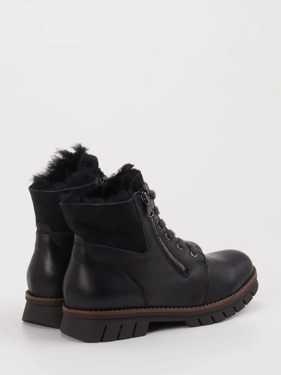 Winterfest mit Stil. Waldläufer präsentiert komfortable Damen-Stiefeletten, ideal für kalte Tage im Alltag oder bei Outdoor-Aktivitäten. Das matte Kalbleder in tiefem Schwarz verleiht der knöchelhohen Silhouette eine cleane, moderne Ausstrahlung. Ausgestattet mit funktionalem seitlichen Reißverschluss, wärmendem Wollfutter und einer griffigen Gummisohle mit markanter Kontrastnaht bietet der Schuh zuverlässigen Halt bei winterlichen Bedingungen. Silberfarbene Details und eine breite Passform unterstreichen den Utility-Charakter. Besonders gut kombinierbar mit Thermo-Leggings und Parka. Ein bequemer Winterboot für anspruchsvolle Tage – mit dem typischen Waldläufer-Komfort.