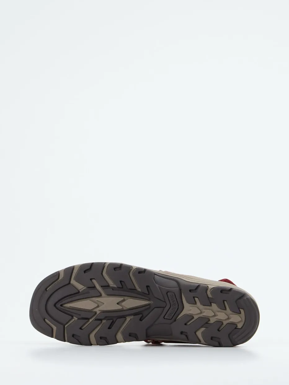 Das samtig angeschliffene Nubukleder in Ziegelrot wird durch beigefarbene Akzente und helle Kontrastnähte stilvoll ergänzt. Drei verstellbare Klettverschlüsse und eine gepolsterte Innensohle sorgen für individuellen Sitz und langanhaltenden Komfort – auch auf längeren Strecken. Die Luftpolstersohle aus Gummi mit ausgeprägtem Profil unterstützt sicheren Tritt. Geeignet für Einlagen, mit klarer Outdoor-Ästhetik im Trend „Functional Footwear“.