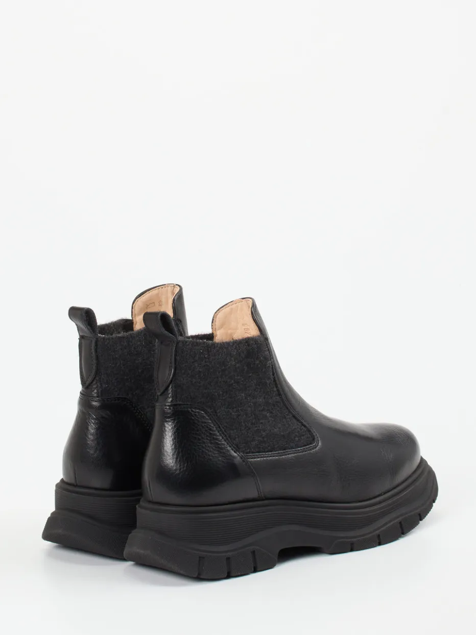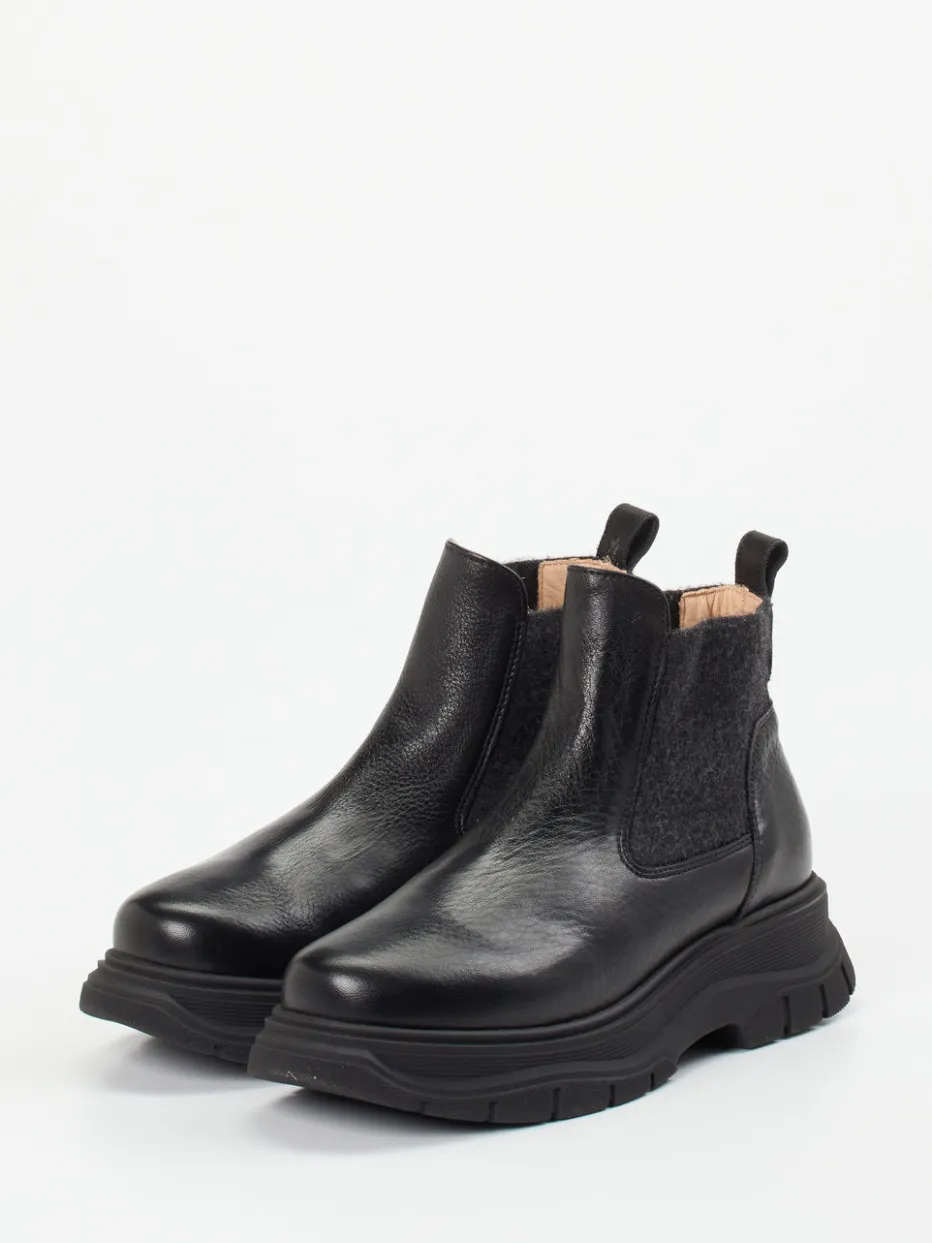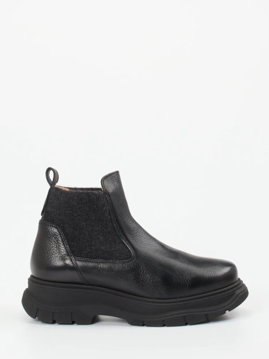 Diese Chelsea-Stiefelette vereint naturgenarbtes Lammleder mit einer dynamischen Chunky-Sohle – ein gelungener Mix aus Komfort, Funktionalität und minimalistischem Designanspruch.