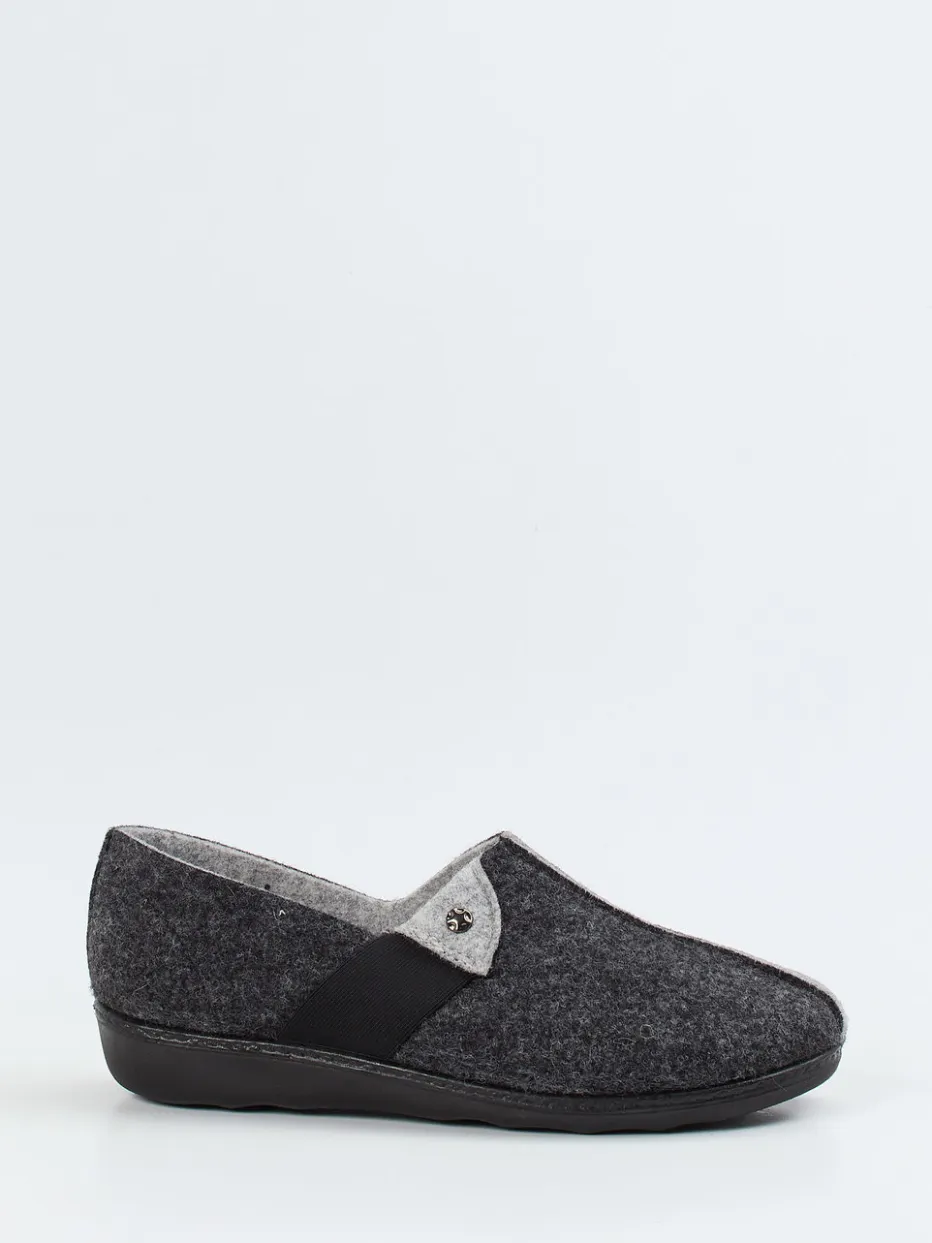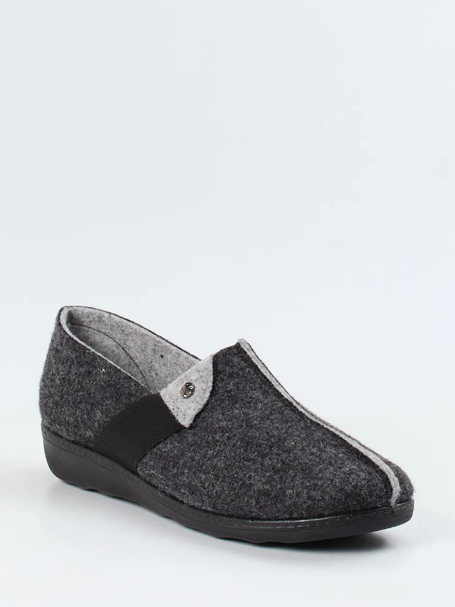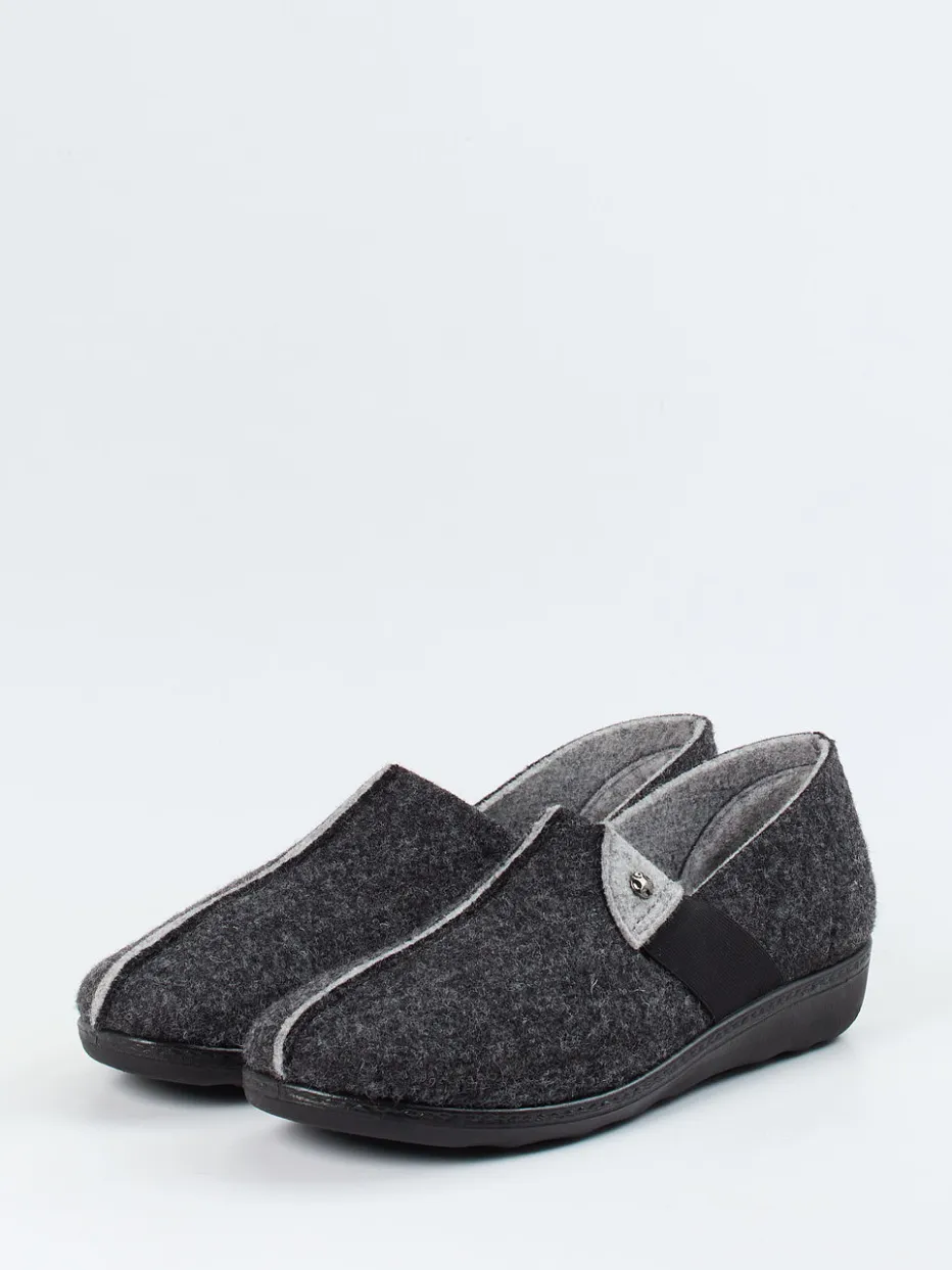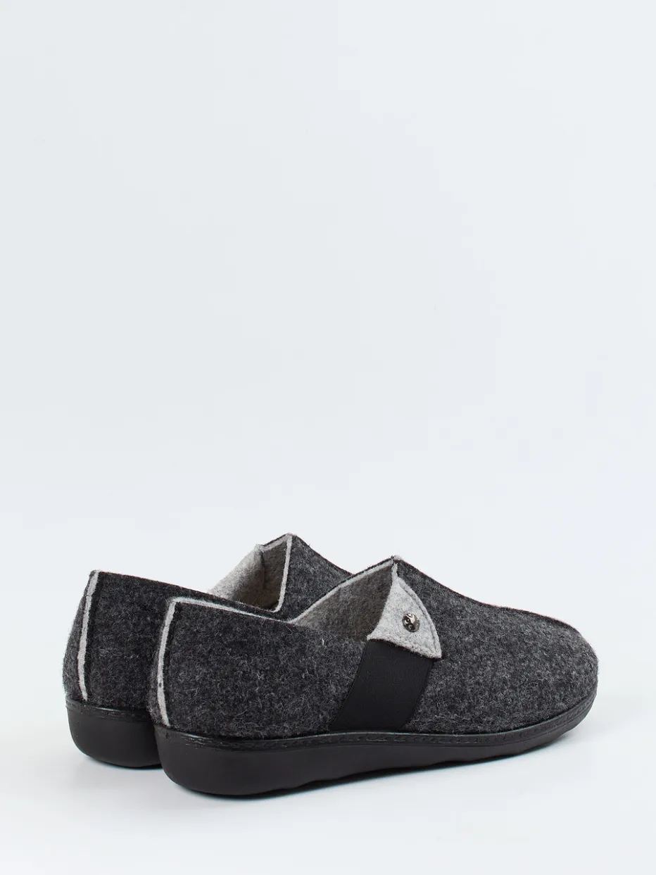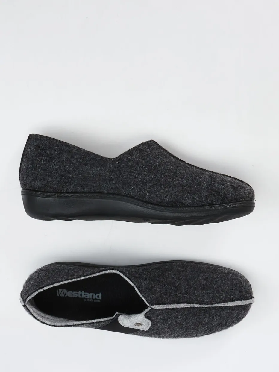 Entspannung trifft Understatement.Westland präsentiert komfortable Filzpantoffeln für Damen im klaren Design. Ob nach Feierabend oder an ruhigen Wochenenden – dieser geschlossene Hausschuh sorgt für wohltuende Wärme und sicheren Auftritt. Das Obermaterial besteht aus dunkelgrauem Filz mit angenehm filziger Struktur, ergänzt durch hellgraue Kontrastpaspeln und einen schwarzen Zierknopf. Der elastische Einsatz erleichtert das Anziehen, das weich gepolsterte Fußbett erhöht den Komfort. Die rutschhemmende PU-Sohle in Keilform dämpft Schritte leise ab. Inspiriert von „Quiet Luxury“ passt das Modell zu loungigen Homewear-Looks in gedeckten Tönen. Reduziert im Stil, bewusst im Detail – Westland steht für entspannte Wohnkultur mit Komfortprofil.