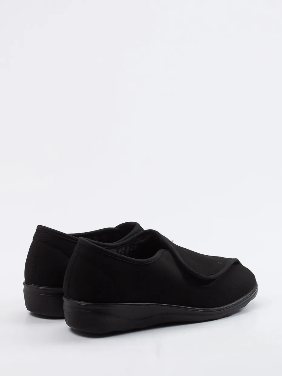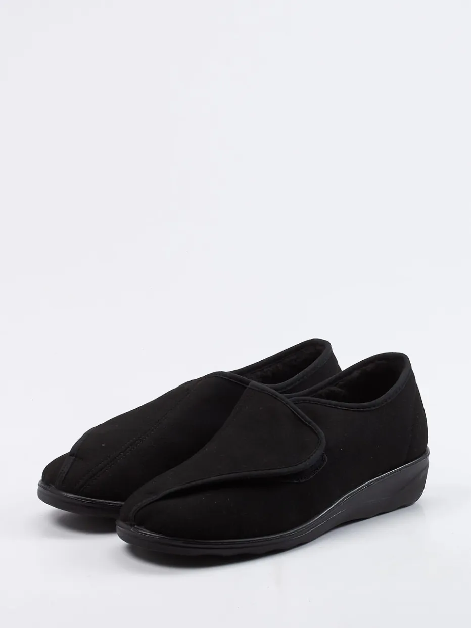 Wärmekomfort im Alltag.Westland präsentiert mit diesem Klett-Hausschuh ein unaufgeregtes Modell für entspannte Momente zu Hause. Für kalte Böden oder ruhige Abende auf dem Sofa: Das schwarze Textilmaterial in samtiger Veloursleder-Optik sorgt für ein angenehmes Tragegefühl, während das kuschelige Innenfutter zuverlässig wärmt. Die geschlossene, rund zulaufende Form unterstützt den Fuß sanft, der praktische Klettverschluss erleichtert den Einstieg. Eine rutschhemmende PU-Sohle federt jeden Schritt weich ab und bietet sicheres Gehen – auch auf glatten Flächen. Der Look ist betont minimalistisch und fügt sich dezent in komfortorientierte Outfits. Ein hausschuhgerechtes Design mit spürbarer Westland-Qualität.