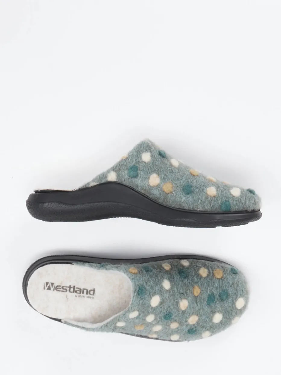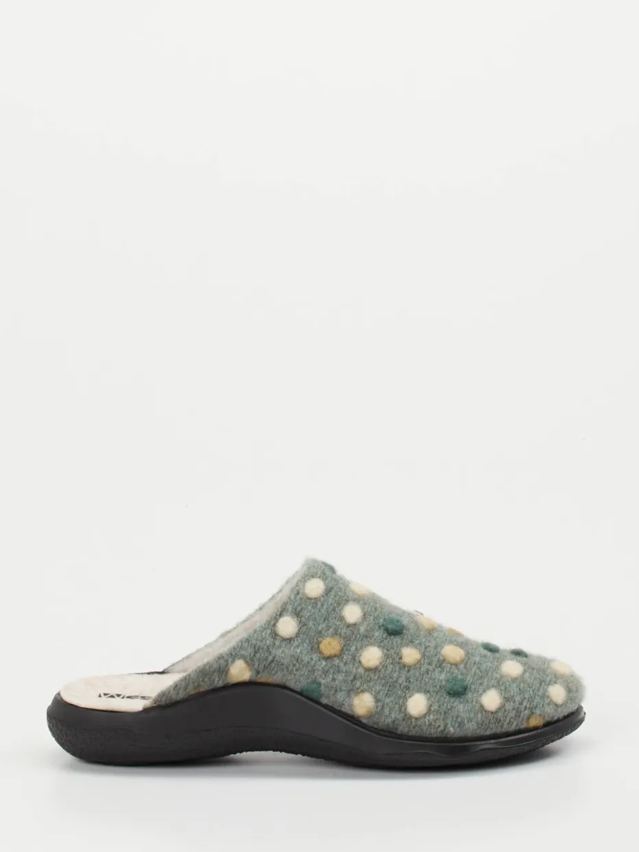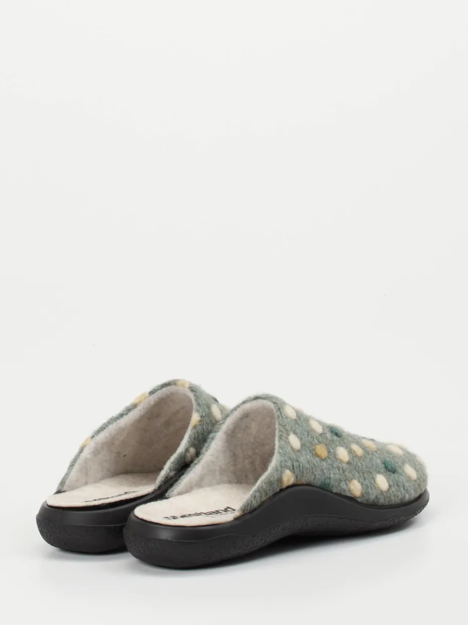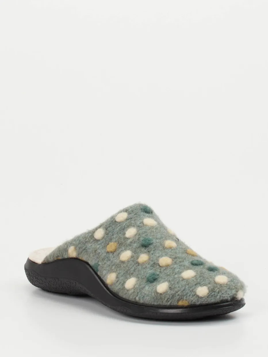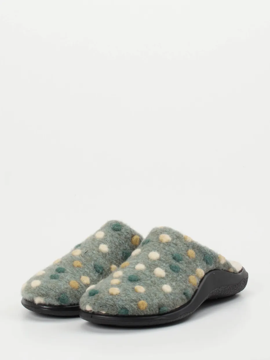 Ideal für entspannte Momente im Wohnbereich bieten die Hausschuhe einen weichen, wärmenden Tragekomfort. Das Obermaterial besteht aus formstabilem Wollfilz mit flauschiger Haptik, veredelt durch mehrfarbige Filzpunkte in Creme, Senfgelb und Tannengrün. Die geschlossene Vorderpartie mit offener Ferse sorgt für bequemes Hineinschlüpfen, während die ergonomisch geformte PU-Sohle Trittsicherheit und eine natürliche Abrollbewegung unterstützt. Der Cozy-Core-Look harmoniert mit gemütlicher Homewear oder softem Strick.