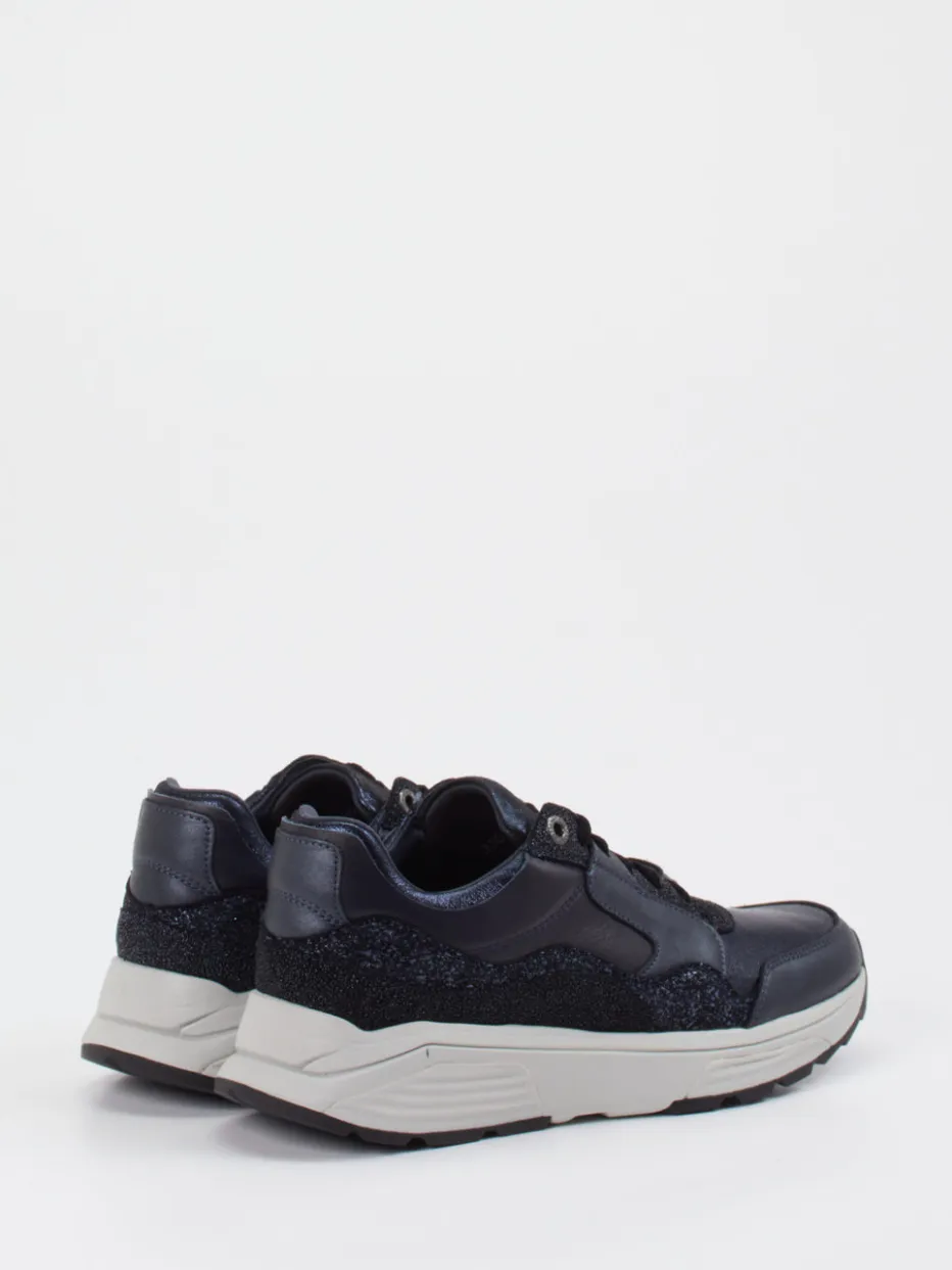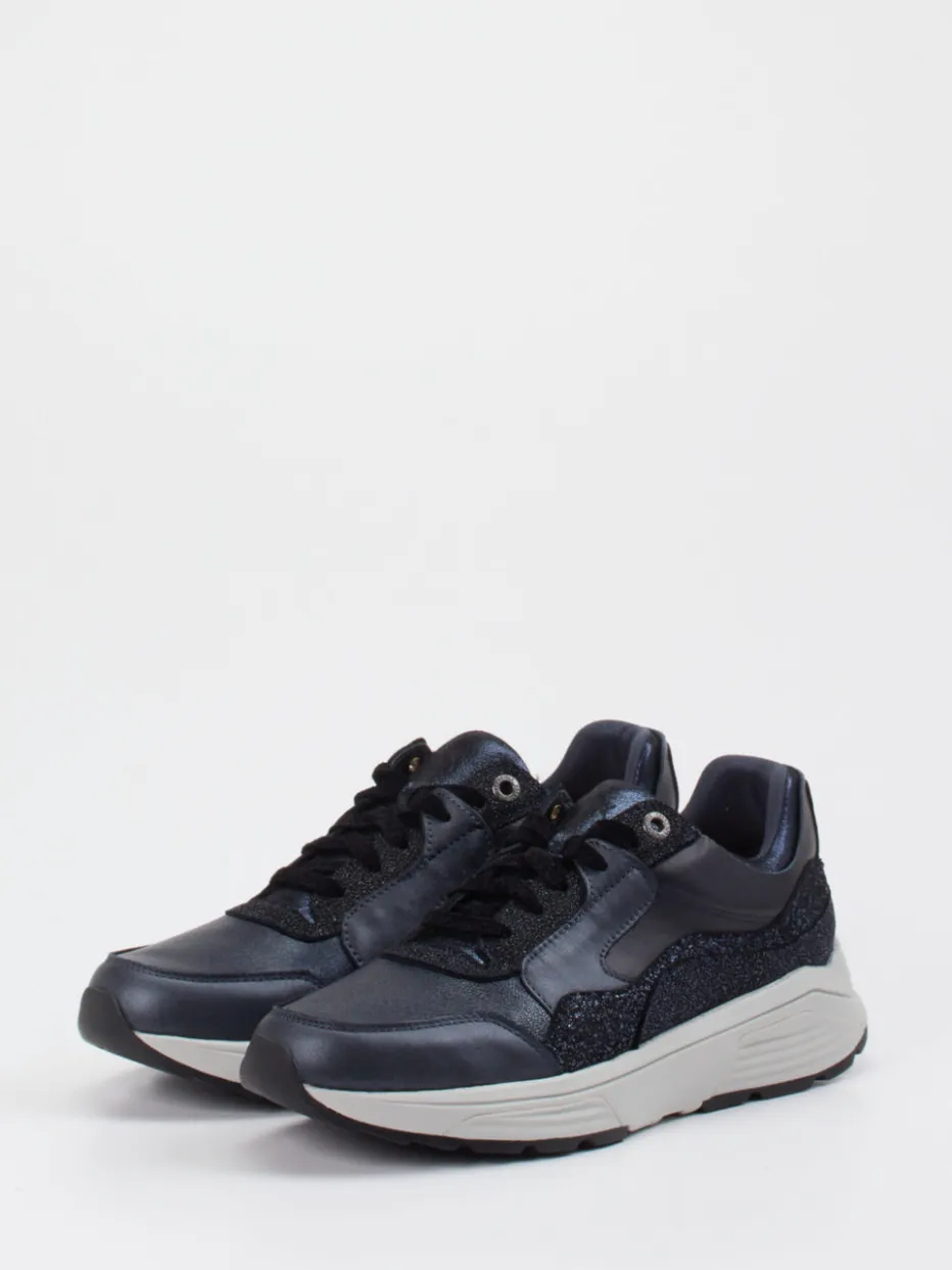 Chunky trifft Glanz – urban interpretiert.Xsensible bringt mit diesem Damen-Sneaker ein sportiv-elegantes Modell für die Freizeit. Ideal für Stadtbummel oder Urlaubstage kombiniert der Schuh geprägtes Leder mit textilen Glitzereinsätzen und glänzenden Overlays. Die dominante Farbe in Dunkelblau wird durch schwarze und hellgraue Akzente ergänzt, während die voluminöse Silhouette und eine robuste Gummisohle trendigen Chunky-Charme verleihen. Glitzertextur, Mesh-Details und eine gepolsterte Ferse runden das Design ab. Der gepolsterte Schaftrand und das herausnehmbare, lederbezogene Fußbett sorgen für spürbaren Tragekomfort. Xsensible verbindet Stilbewusstsein mit Bequemlichkeit auf hohem Niveau.