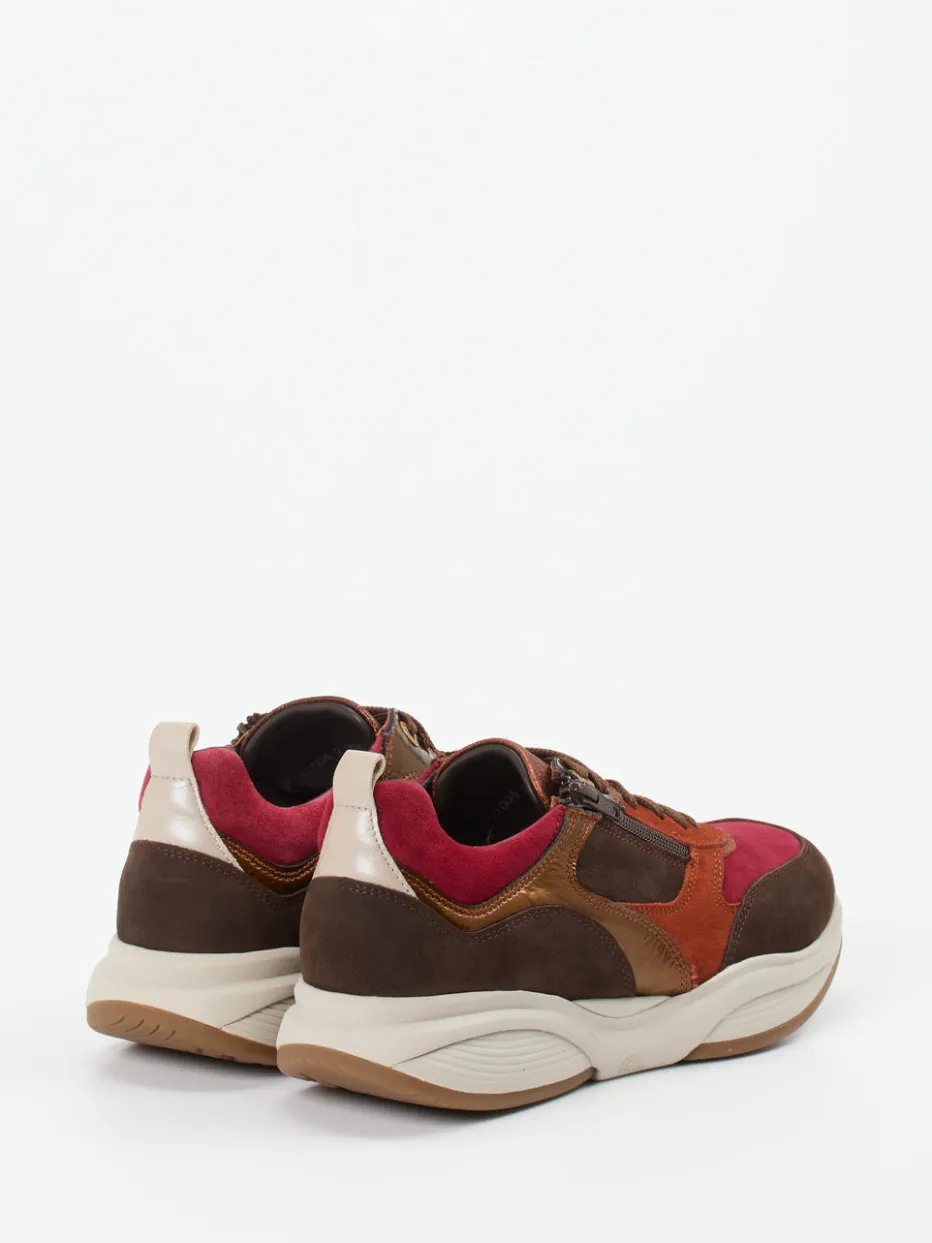 Hingucker für den Alltag.Xsensible präsentiert einen Damen-Chunky-Sneaker, der Komfort und Design vereint. Perfekt für urbane Freizeitmomente sorgt das Modell mit seiner voluminösen Silhouette und dämpfenden Gummisohle für bequemen Halt. Die Obermaterialien aus Veloursleder, ergänzt durch kupferfarbene Metallic-Elemente, zeigen eine spannende Kombination aus matter und glänzender Textur. Farbakzente in Dunkelbraun, Beerenrot und Kupferorange folgen einem modernen Color-Blocking-Trend. Der seitliche Reißverschluss erleichtert das Anziehen, während Retro Running-Elemente und Streetwear-Einflüsse einen modischen Ausdruck liefern. Harmoniert ideal mit erdigen Tönen oder herbstlichen Layer-Looks. Ein multisensorisches Erlebnis mit durchdachter Funktionalität und progressivem Stil.